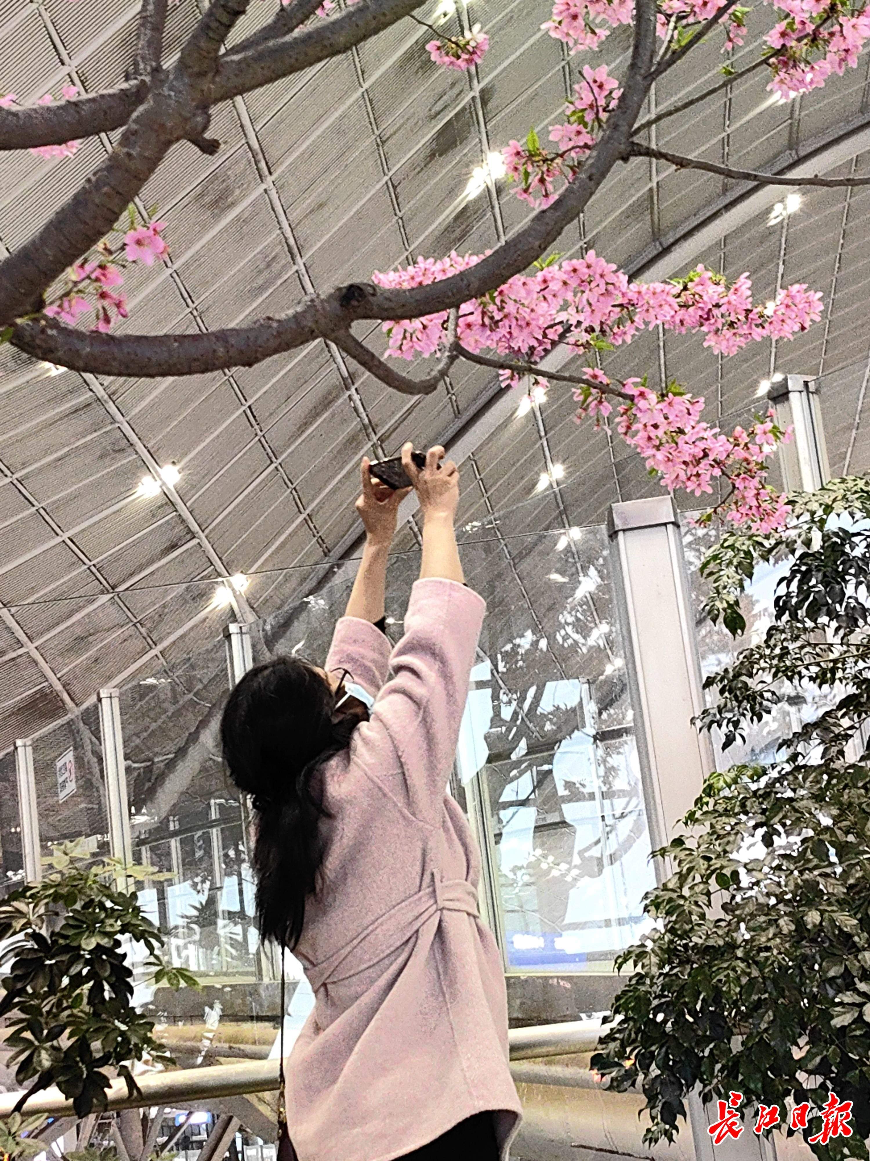 同样感到新奇的,还有来汉赏樱返程的外地旅客陈女士一行。在西进站口站厅内,她和两名同伴看到10余株樱花,欣赏了半天。“我还是头一次在火车站内看到樱花。”陈女士说,这道独特的风景,很有创意。