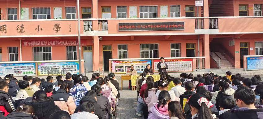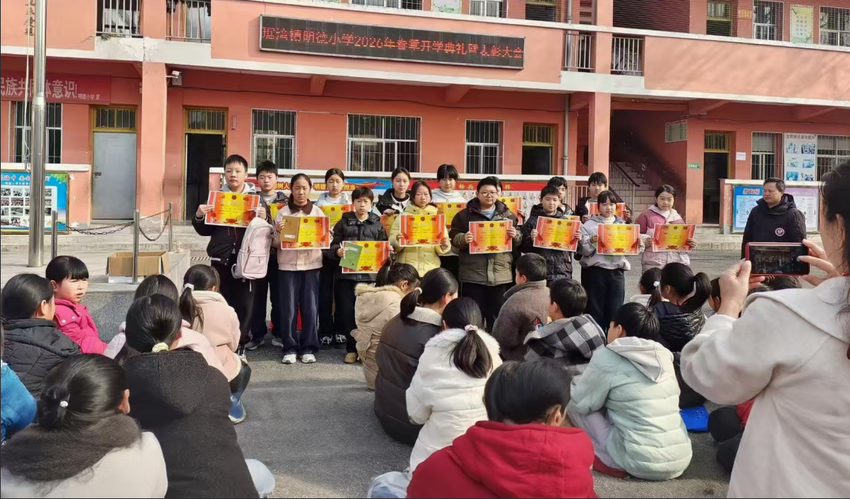 湖北日报客户端讯(通讯员李小锋)春风浩荡启新程,奋楫扬帆向未来。日前,枣阳市琚湾镇明德小学全体师生欢聚校园,举行2026年春季开学典礼暨表彰大会,表彰先进、树立标杆,凝聚奋进力量,共赴崭新征程。