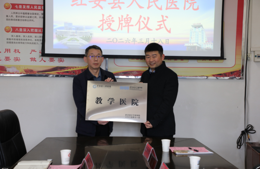 会上,武汉设计工程学院副校长邱朝坤为红安县医共体总医院(红安县人民医院)党委副书记、院长阮应东授予教学医院牌匾。
