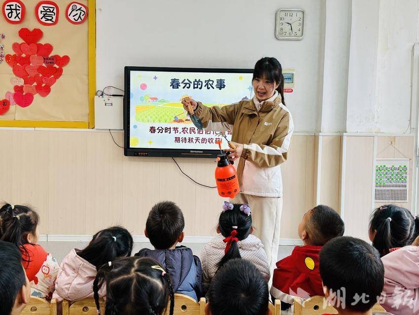 活动伊始,老师通过生动的课件向孩子们讲解春分的由来与意义:“春分是二十四节气之一,这一天昼夜平分,也是农耕播种的好时节。”孩子们睁着好奇的眼睛,认真聆听春分的气候特点、农事习俗,还通过图片认识了农民伯伯春耕的场景,了解到“春种一粒粟,秋收万颗子”的自然规律。老师拿出小铲子、喷壶等农具,向孩子们演示播种工具的用法,让大家直观感受农耕劳作的细节。