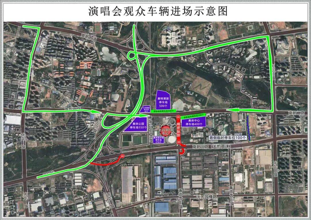 (1)市内及雄楚高架方向来,建议走光谷一路、高新二路。(2)南三环线方向车来车,建议走高新立交、高新大道、光谷三路、高新二路。(3)北三环线方向来车,建议走新武黄立交高新二路匝道、高新二路。(4)奥体公园三号路、奥体公园南路实行单向通行,奥体公园路停车场出场车辆一律由奥体公园东路、奥体公园南路路驶入三环线。(5)高新二路西向东车辆由光谷三路上高新大道;高新二路东向西车辆由光谷一路上高新大道。