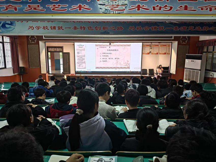 此次活动由还地桥中心卫生院公共卫生科结核病防治专员刘绘娟主讲,结合PPT演示,她通过浅显易懂的语言,深入浅出地讲解了结核病的定义、常见症状、危害、发现方法及预防措施,同时结合春季传染病高发特点,介绍了传染病基本知识、防控依据、主要传染病及防控要点。在互动环节,针对师生提出的问题,她一一进行耐心解答,现场氛围热烈。