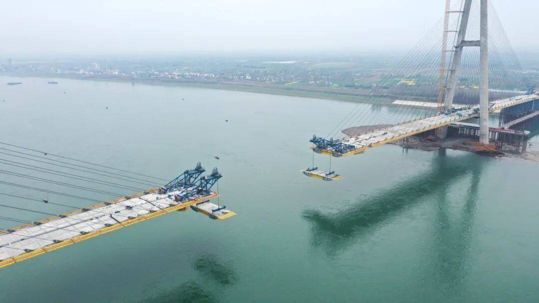 作为当枝松高速公路项目的控制性工程,枝江长江大桥全长1549米,主跨890米,连接枝江市区与百里洲镇,是目前在建的世界跨径最大的钢—UHPC组合梁斜拉桥。在建设者的坚守和各部门的保驾护航下,枝江长江大桥桥面正向着江心稳步延伸,“天堑变通途”的新篇章也将在这里续写。