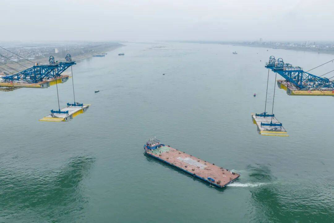 首次实行两岸钢箱梁同步吊装作业