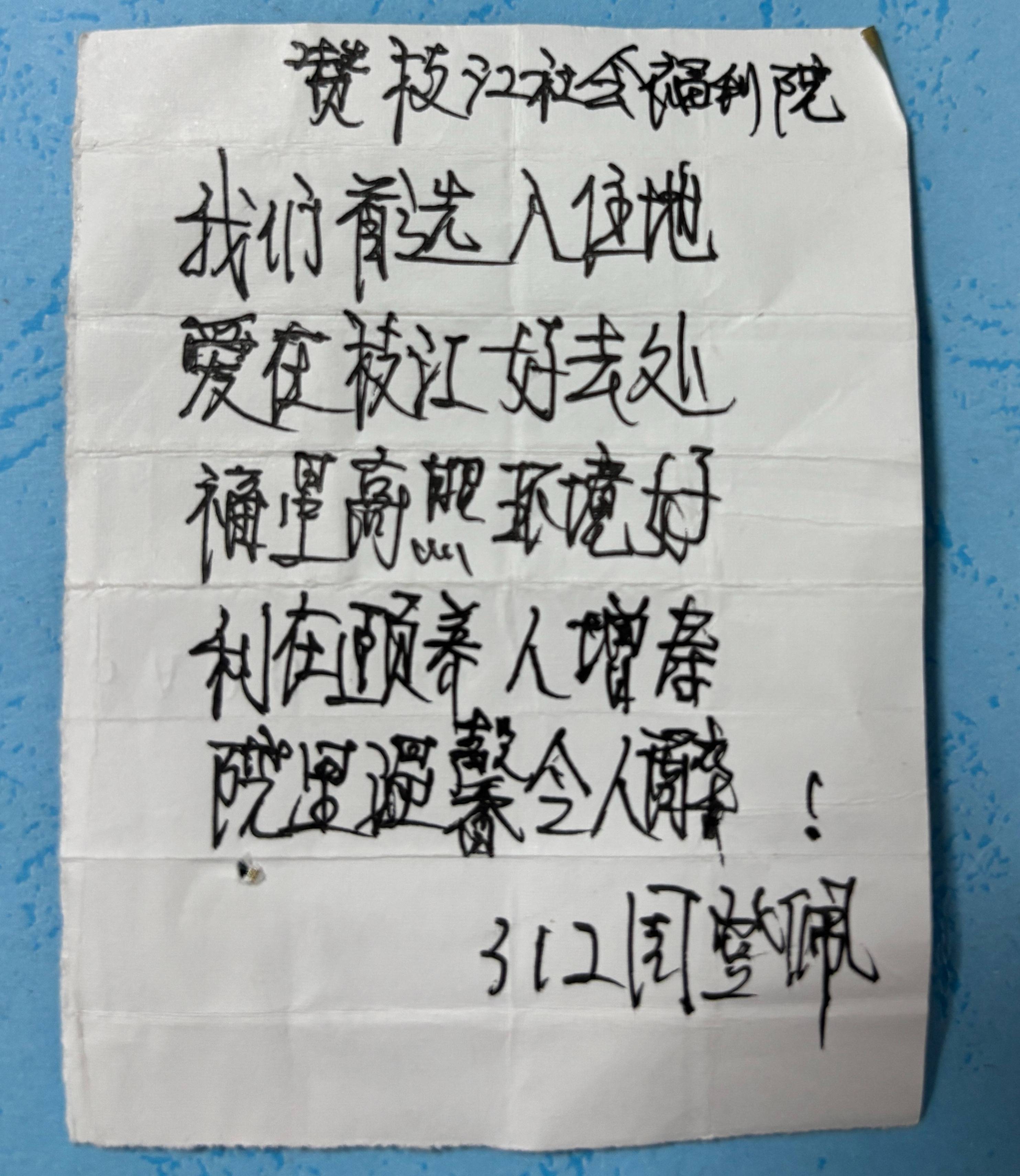 纸短情长寄心声——枝江市社会福利院接连收到院民手写感谢信与诗歌