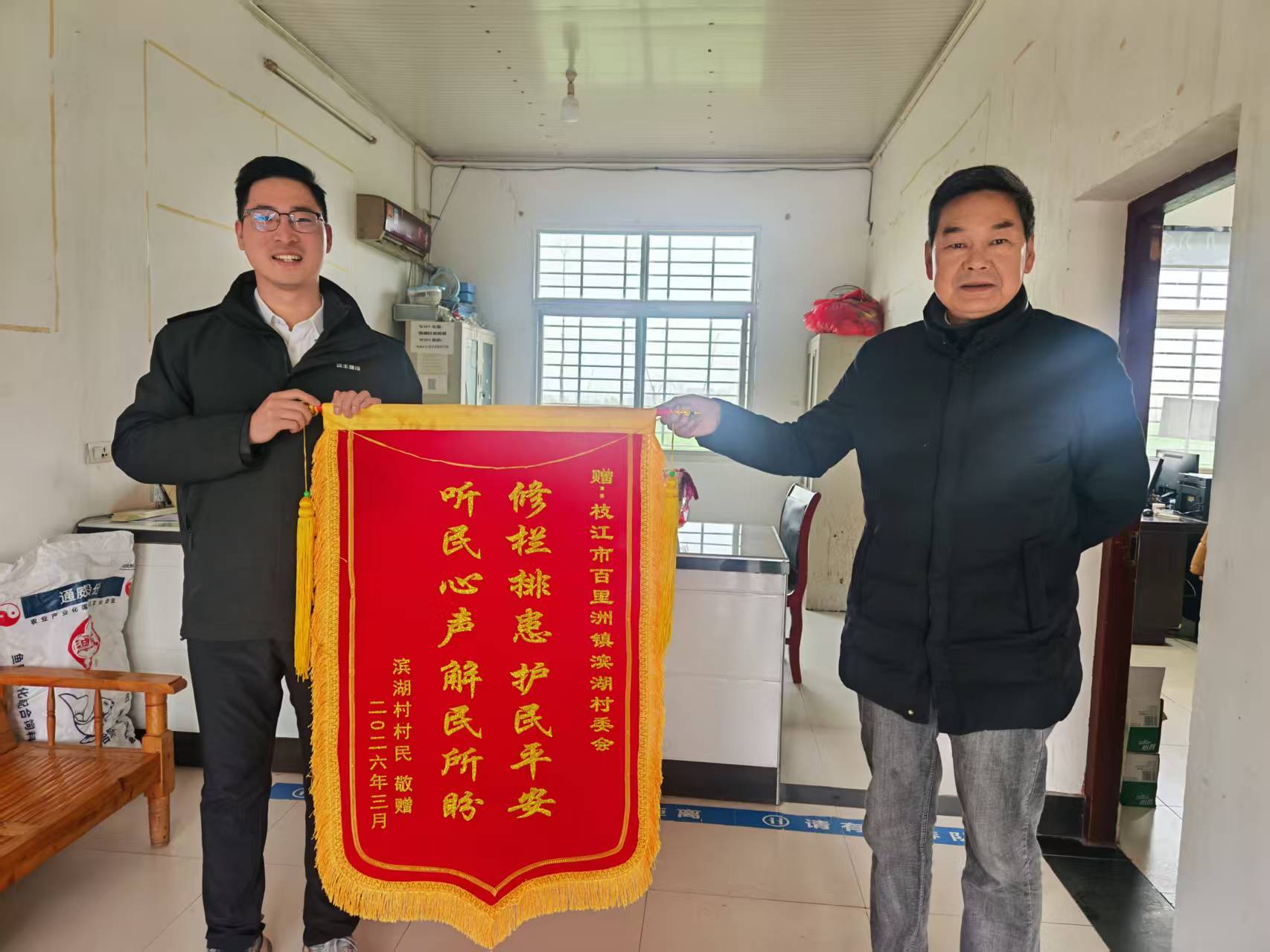 湖北日报客户端讯(通讯员 周晨昀)“真是太感谢政府了!这么快就帮我解决了家门口的安全隐患,现在出门心里踏实多了!”3月17日下午,枝江市百里洲镇滨湖村村民怀着感激之情,将一面印着“修栏排患 护民平安 听民心声 解民所盼”的锦旗送到村委会,以此致谢基层干部高效处置民生隐患、切实为群众办实事。