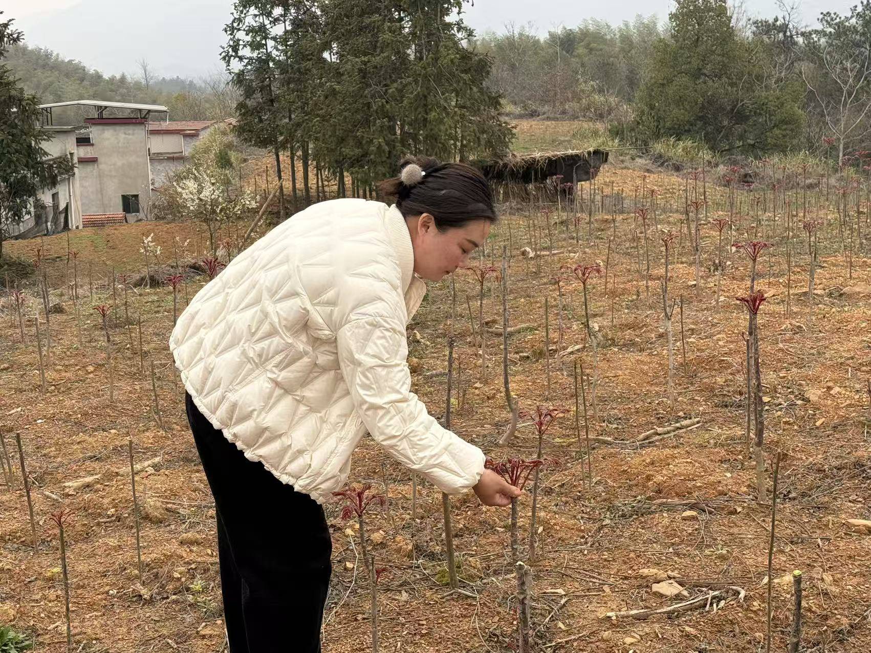 这片香椿基地,是杨林村盘活荒山荒地、发展村集体经济的新尝试。“起初我们发现,村里有不少村民采摘野生香椿拿到市集上卖,能有一笔不错的收入。”双溪桥镇杨林村党总支书记王奖锡表示,此前这片土地还是一片荒山,村里结合村民的种植意愿和本地实际,决定将这片闲置荒地平整改造,打造香椿种植基地,由村集体主导运营,核心就是“把产业风险扛在集体肩上,不让村民承担损失”。