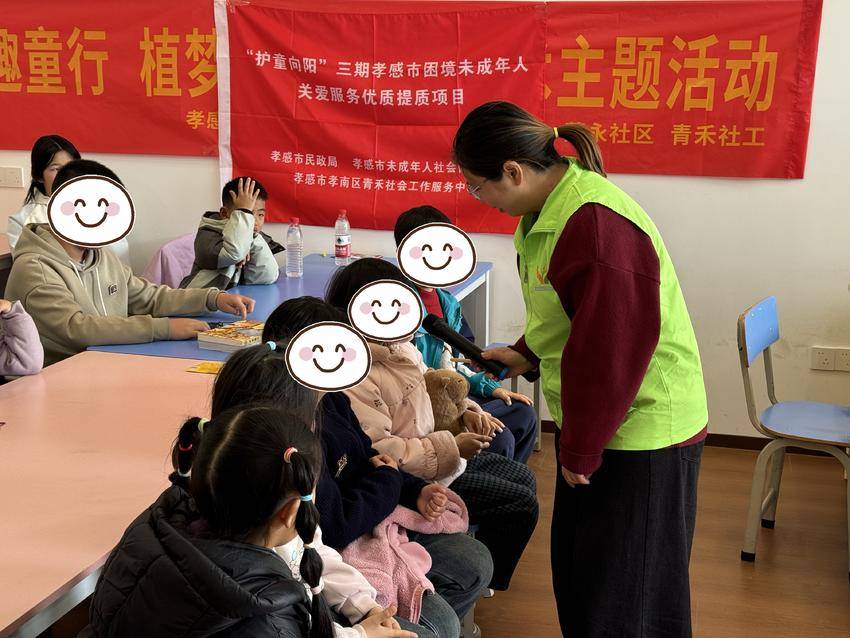 活动在“春天诗句接龙”中拉开序幕。社工以一句“春眠不觉晓”开场,孩子们围坐成圈,依次接龙与春天相关的诗句、词语或事物。现场气氛轻松活跃,欢声笑语不断。