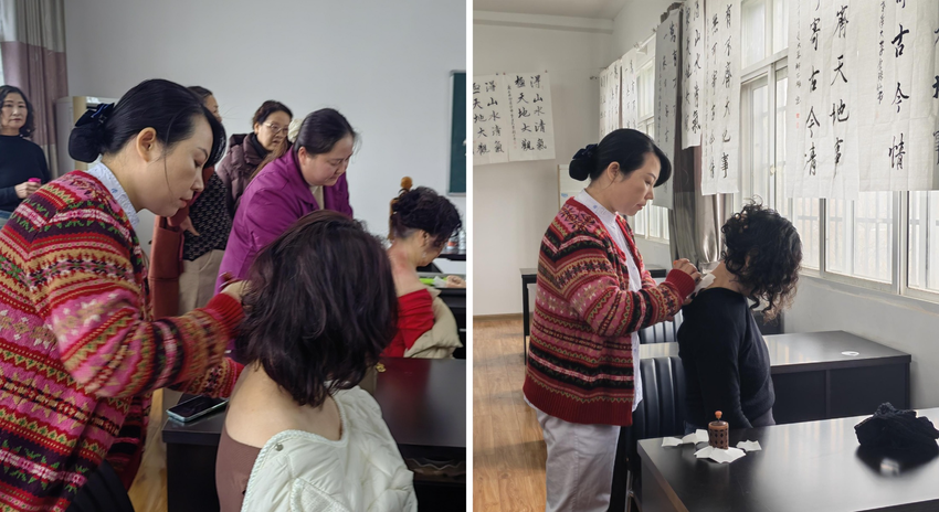 理论讲解后,活动进入了深受欢迎的中医特色疗法体验环节。医护团队现场为老同志们提供了火龙罐、艾灸等中医外治技术体验,依据个人体质进行经络疏通与气血调和。