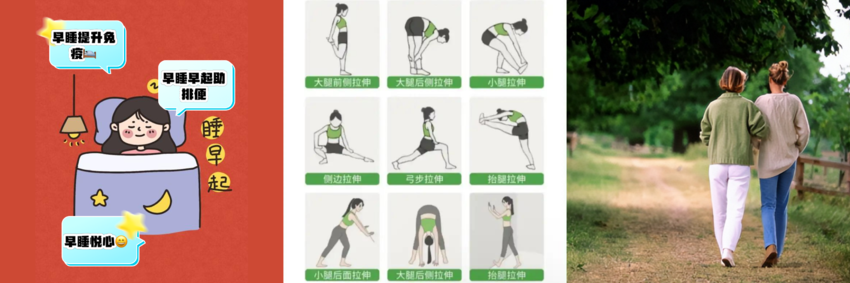 作息:夜卧早起,顺应阳气升发。建议晚上11点前入睡,晨起去户外散散步,伸伸懒腰,畅达气机。