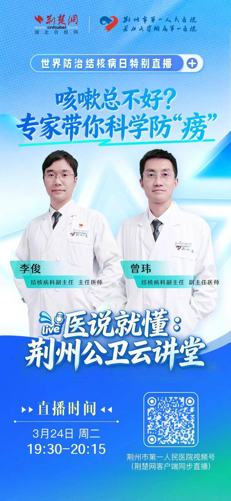 3月24日(周二)19:30,正值世界防治结核病日,荆州市第一人民医院、长江大学附属第一医院联合荆楚网特别策划——世界防治结核病日特别直播《咳嗽总不好?专家带你科学防“痨”》。