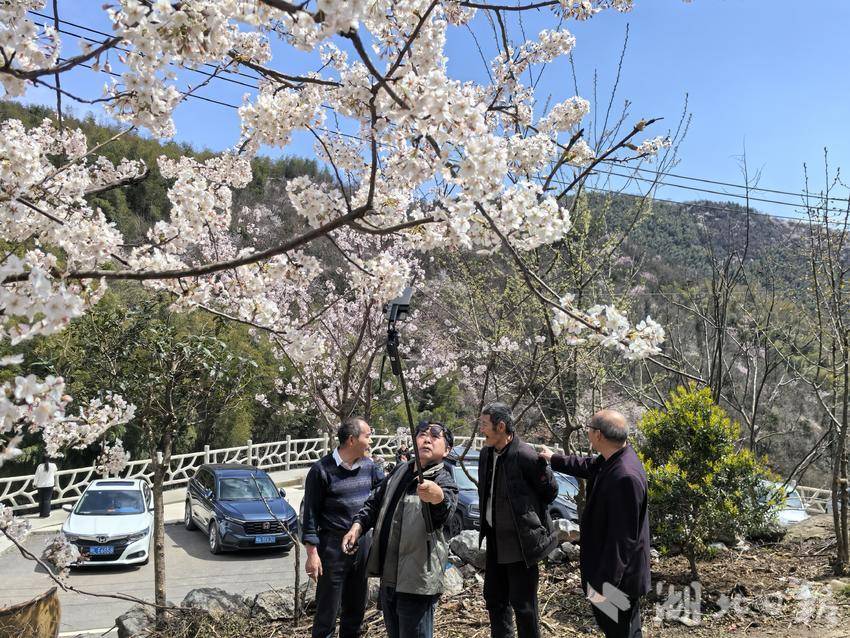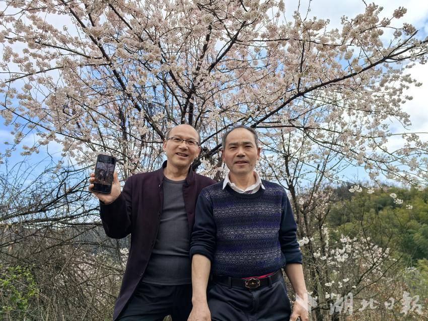 “来,笑一个,手指远山,这个姿势超酷!”来自温泉的胡先生,带着85岁的老父亲前来踏青赏花,特意选了一株花开得白如雪、粉似霞,团花簇锦的樱花树为父亲拍照,逗得老人笑颜舒展,浓浓孝心在花海间尽显。