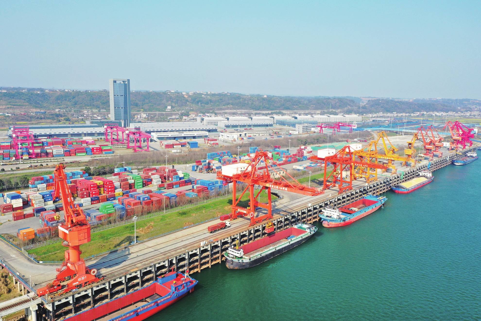 连日来,宜昌港务集团白洋港区紧抓船舶到港高峰机遇,港口生产热潮涌动、火力全开,生产运营全线飘红。截至目前,白洋港累计完成集装箱吞吐量3.2万标箱、散货吞吐量71.18万吨,生产经营实现首季“开门红”。图为3月20日白洋港区一角。(通讯员李齐悦 摄)