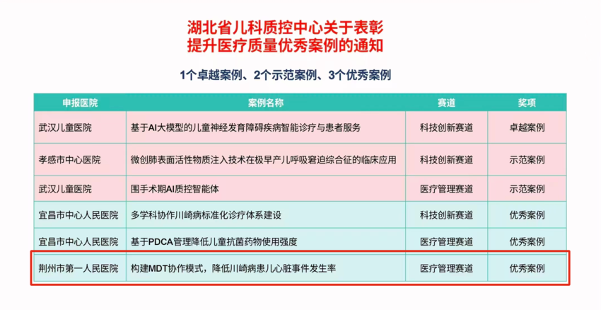 近日,湖北省儿科医疗质量控制中心“提升医疗质量优秀案例”评选结果揭晓。荆州市第一人民医院、长江大学附属第一医院儿科报送的“构建MDT协作模式,降低川崎病患儿心脏事件发生率”项目,在全省各级医院的激烈角逐中脱颖而出,荣获“医疗管理赛道”优秀案例。