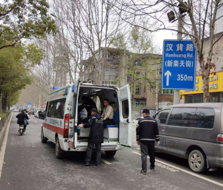 10点56分,家属赶到现场。众人正准备搀扶老人起身时,肖爹爹突然面露痛苦,喊道“腿疼,动不了”。见此情形,网格员迅速与家属沟通,当机立断拨打了120急救电话。在等待救护车的过程中,工作人员轻声安慰老人:“爹爹您放心,救护车马上就到,到医院就不疼了。”