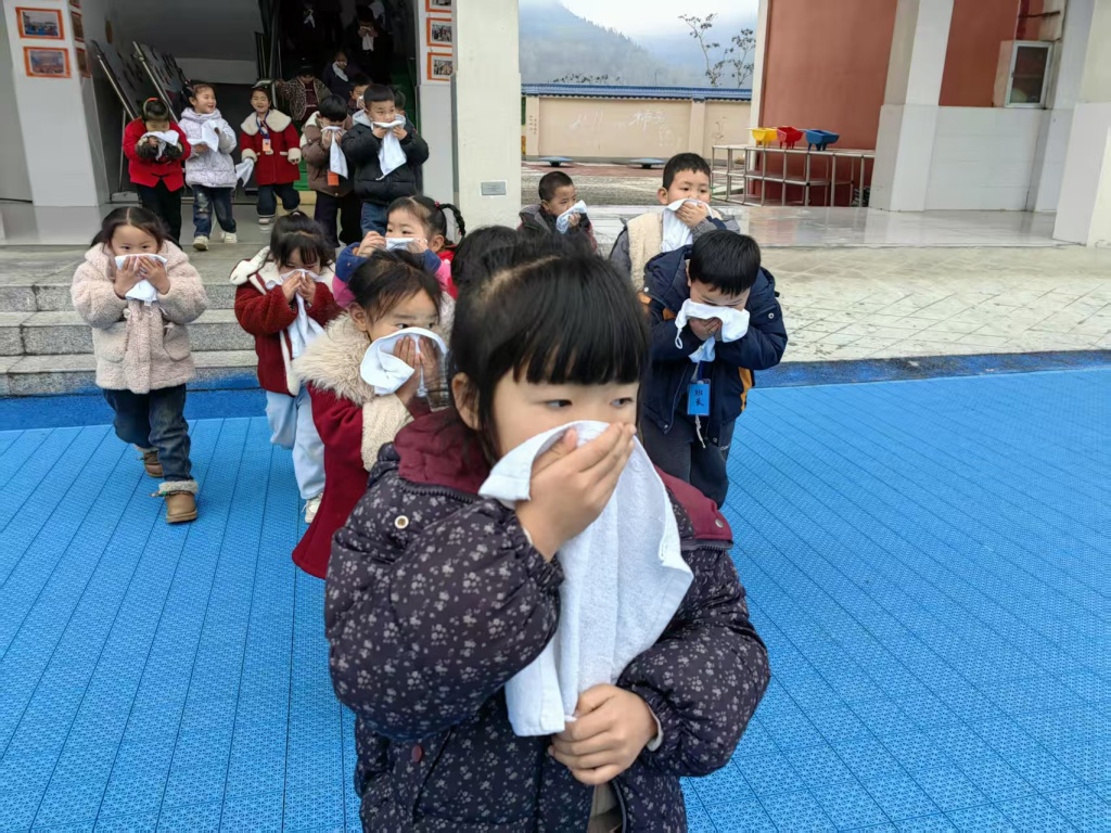 上午10时,随着警报声急促响起,消防演练正式开始。各班教师立即停止活动,快速组织幼儿用湿毛巾捂住口鼻,弯腰俯身、紧贴墙壁,沿着预定安全路线有序、快速撤离。整个过程紧张有序、动作规范,无拥挤、无喧哗,全体师幼仅用2分钟便安全撤离至操场指定安全区域。