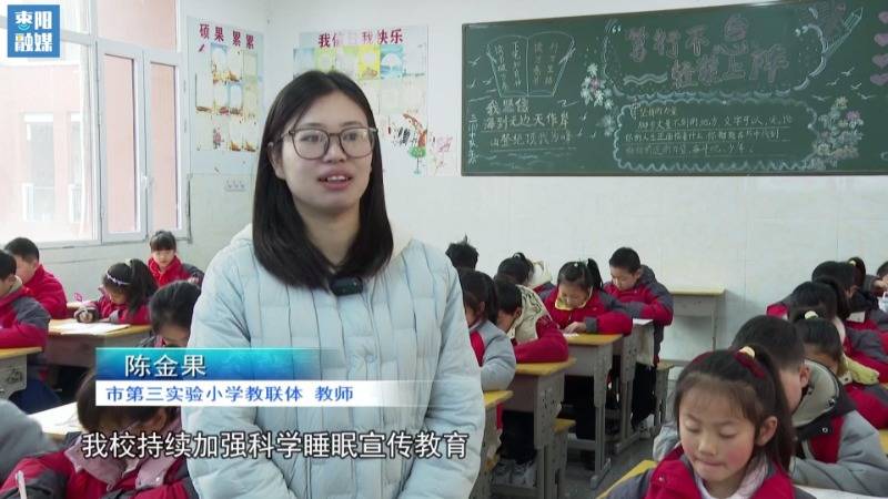 枣阳市第三实验小学教联体教师 陈金果:我校持续加强科学睡眠宣传教育,积极引导师生合理安排作息时间,严格规范学生到校时间,督促教师科学合理布置作业、不断优化作业设计。目前,我校已有96%的学生参加课后服务,在教师辅导下高效完成作业,切实保障充足睡眠,促进学生身心健康与全面发展。