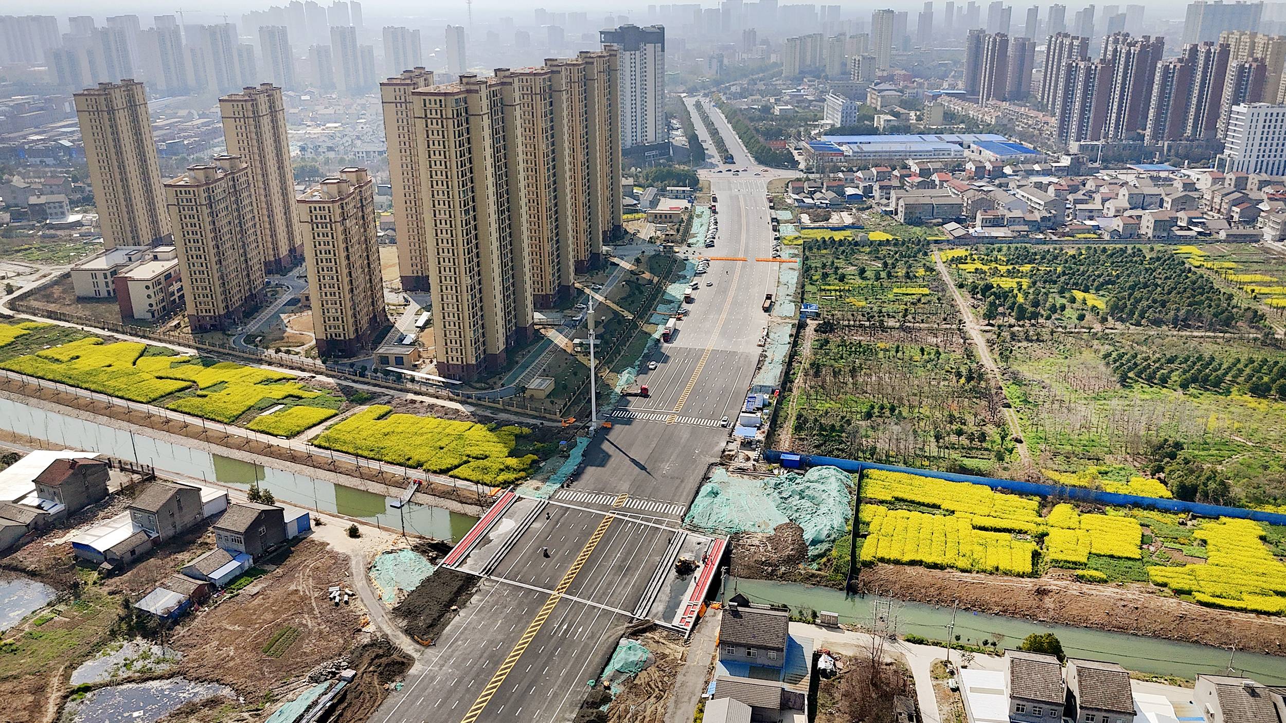 目前,全线控制性工程县河桥、青龙沟桥两座桥梁主体已全部完工,东城大道至潜江大道段主车道全线贯通,人行道渣石回填完成90%,绿化土回填完成80%,现正推进人行道收尾、绿化种植及交通、照明系统安装工作,预计于2026年6月底完工。