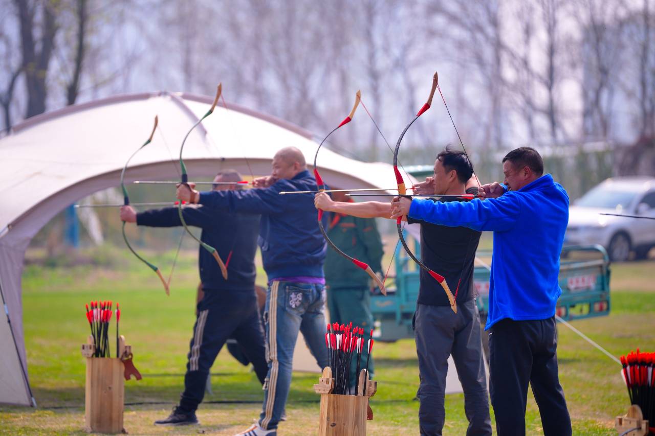 一旁的射箭区同样热闹非凡。拉弓、瞄准、松弦,箭矢破空而出、稳稳命中靶心,利落的动作引来阵阵喝彩,为春日营地增添了别样飒爽,更让这片原本主打“躺平”的露营地,多了一分“江湖气”。