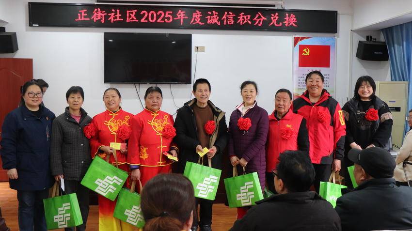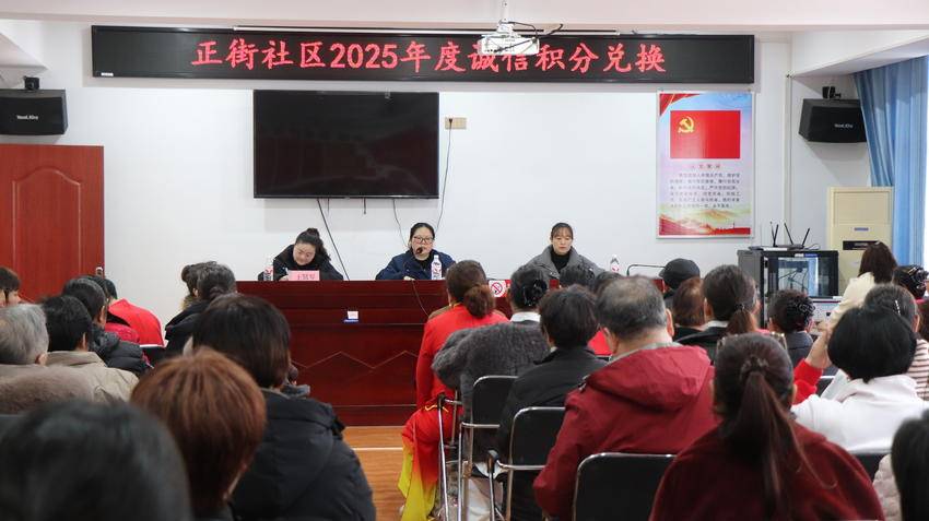 在正街社区四楼会议室开展2025年度诚信积分兑换仪式。本次积分兑换品类丰富,涵盖实用生活用品与多元面值购物券,有效激励了居民参与社区治理、践行文明行为、恪守诚信公约的积极性。积分制度的落地,进一步弘扬了“奉献、友爱、互助、进步”的志愿精神,激发了广大群众,尤其是老年群体投身社区建设、服务基层群众的内生动力。