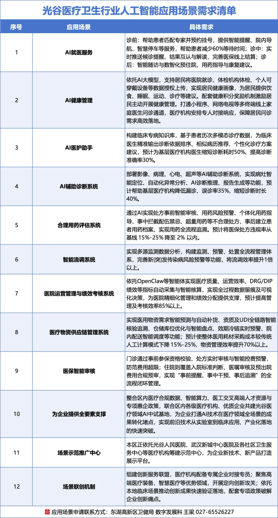 即光谷医疗卫生行业人工智能应用场景需求清单。清单涵盖AI就医服务、AI健康管理、AI医护助手、AI辅助诊断系统、合理用药评估系统等12个具体场景(详见文末)。相关负责人介绍,一些光谷企业开发的医疗AI产品缺乏真实试验场所,光谷已建成投用7家三甲医院,是医疗AI产品的真实“试验场”。政府联合医疗机构主动搜集并发布这些场景需求清单,企业可根据产品特点申请场景,加速技术落地应用。