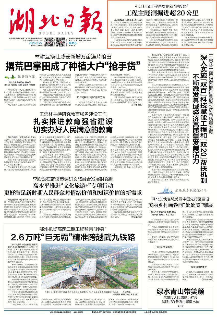 湖北日报讯 (记者彭磊、通讯员赵发)从南水北调集团江汉水网公司获悉,开工4年的引江补汉工程再次刷新“进度条”,截至3月24日,工程主隧洞累计掘进超20公里,占总里程的10.3%,支洞累计掘进超36.9公里,全线10台TBM(硬岩隧道掘进机)集群实现8台始发掘进。