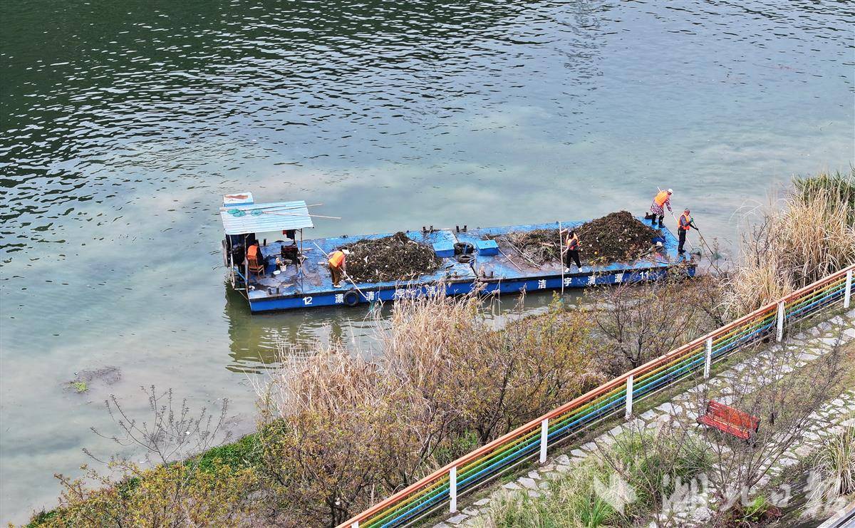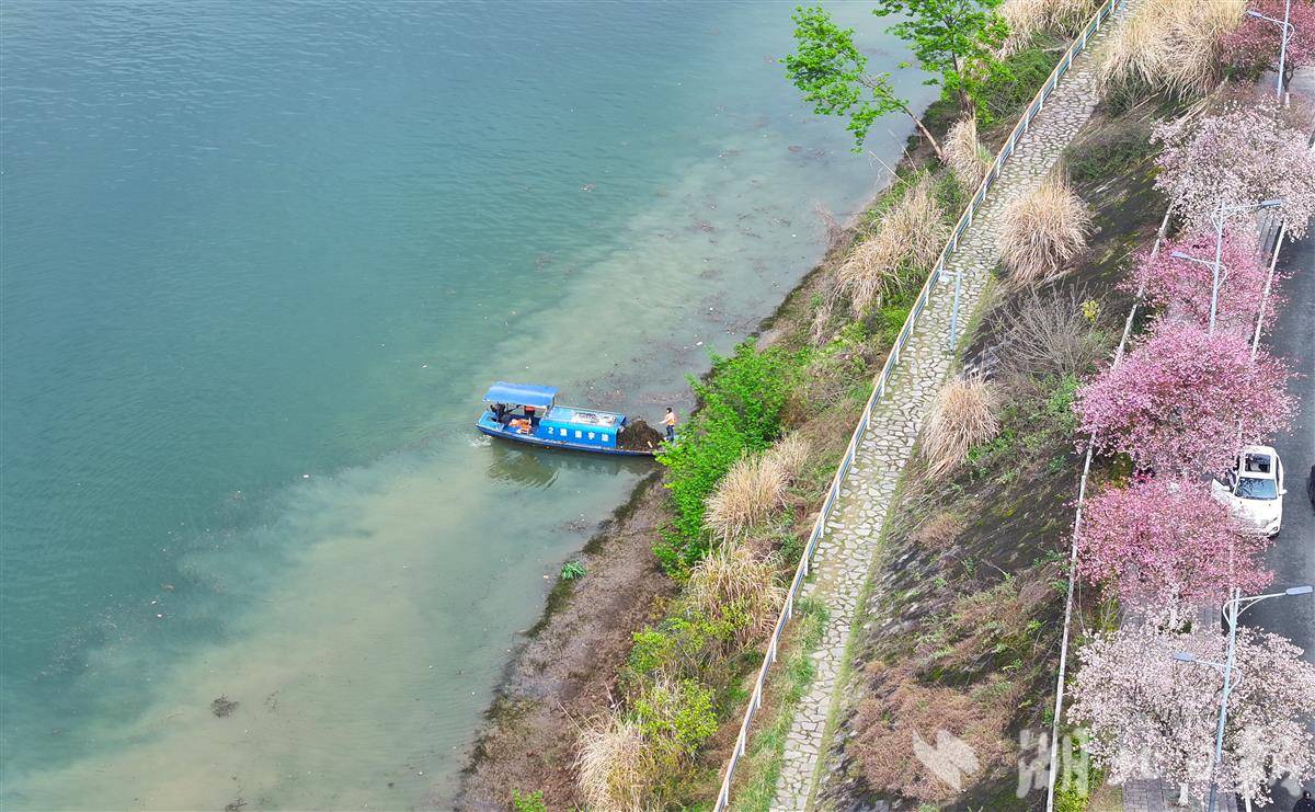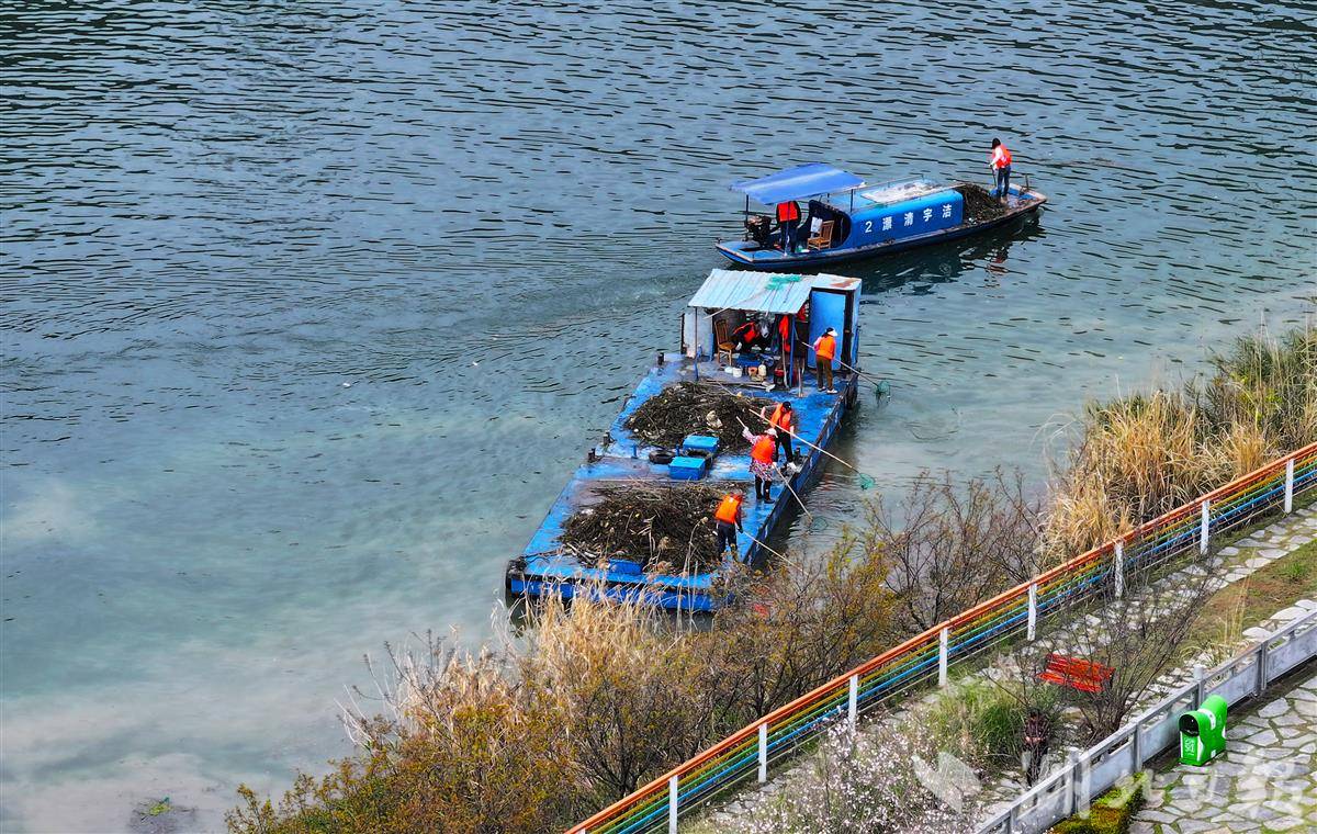 3月26日宜昌市夷陵区黄柏河边两艘清飘船正抓紧作业施工,清理水面上和附着在岸线上的漂浮物,确保在汛期来临之前这些漂浮物打捞上岸,保护中华鲟和江豚春繁安全。