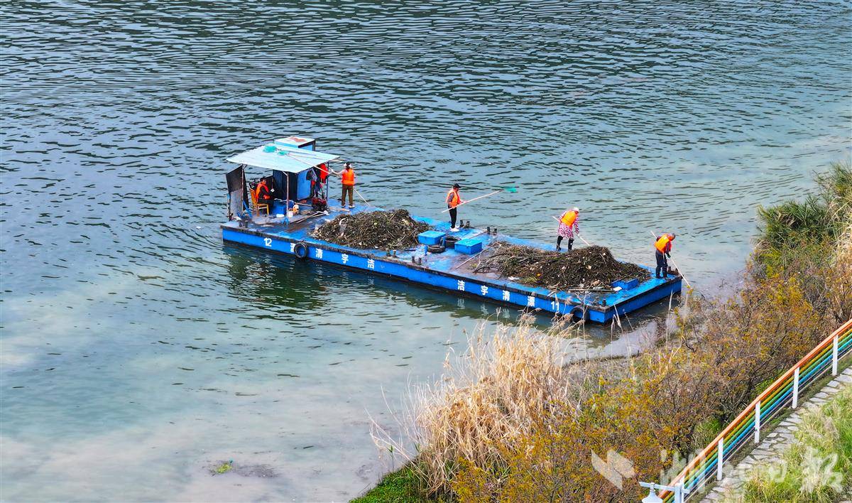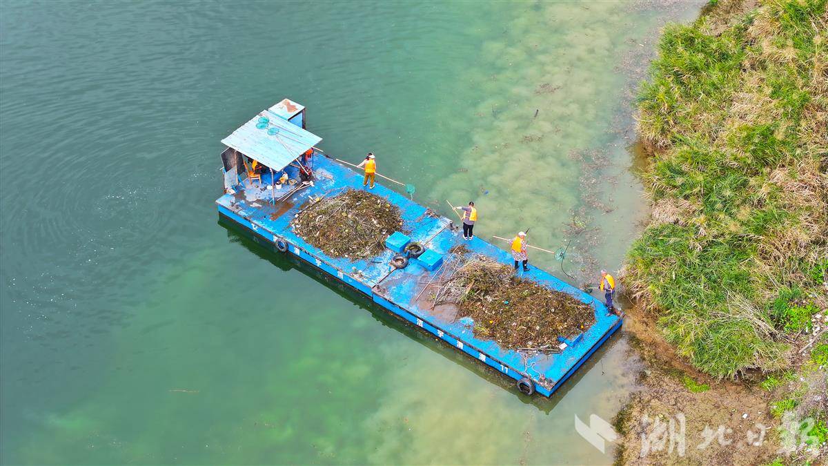 3月26日在宜昌市夷陵区黄柏河边4名工人正在打捞漂浮物。