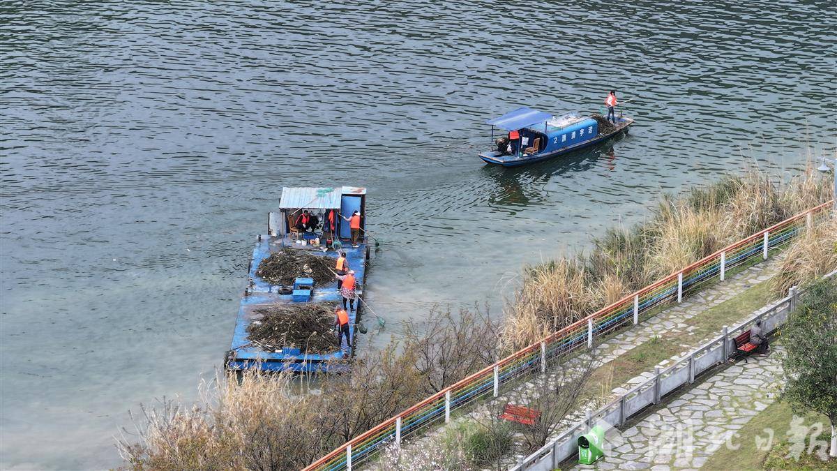 3月26日,宜昌市夷陵区黄柏河边两艘清漂船正抓紧作业施工,清理水面上和附着在岸线上的漂浮物,确保在汛期来临之前这些漂浮物打捞上岸,保护中华鲟和江豚春繁安全。