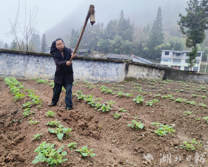 3月27日上午,天气既不冷,也不热,好做农活。咸丰县坪坝营镇青岗坝村村民张孝德挥锄翻土,准备移栽用营养土培育的苞谷苗。