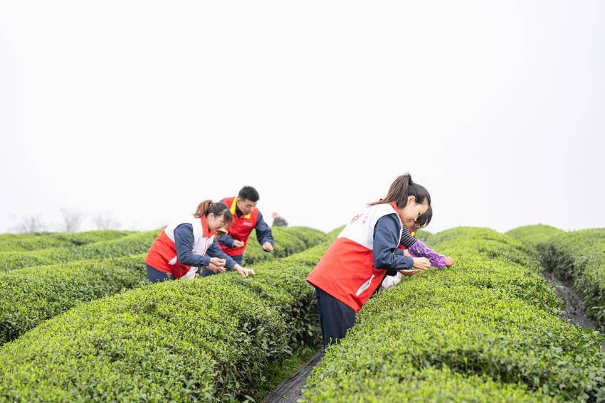在娘娘山农庄茶园,身着红马甲的供电青年志愿者们与茶农一道穿梭于茶垄之间。他们在茶农指导下学习采摘技巧,手指翻飞间,一芽一叶被轻轻摘下。“平时在变电站跟设备打交道,今天来茶园跟茶叶打交道,能帮茶农抢收春茶,感觉特别有意义。”青年志愿者小陈一边采茶一边笑着说。