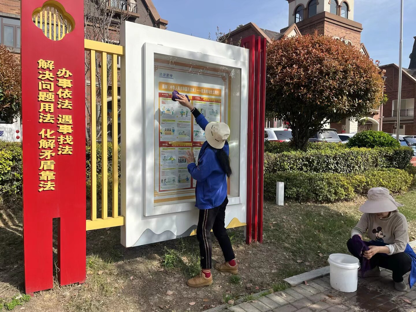 活动伊始,社区工作人员与保洁人员提前明确分工、划分责任区域,重点对辖区公共广场、绿化带、口袋公园等卫生死角进行集中清理。大家热情高涨、干劲十足,自带扫帚、簸箕、抹布、垃圾袋等清洁工具,迅速投入到清洁工作中。社区工作人员以身作则,带头清理白色垃圾;物业公司保洁人员则专注于公共区域的清扫如沿街公益展板、口袋公园宣传牌等,不放过任何一个卫生盲区。
