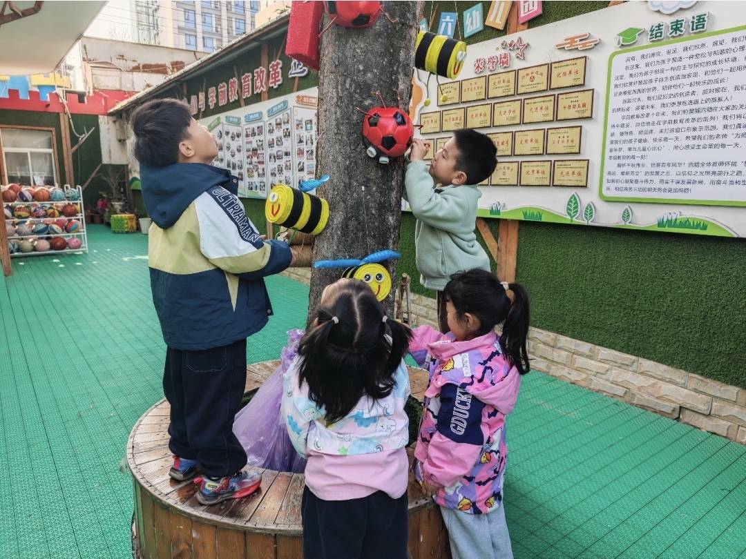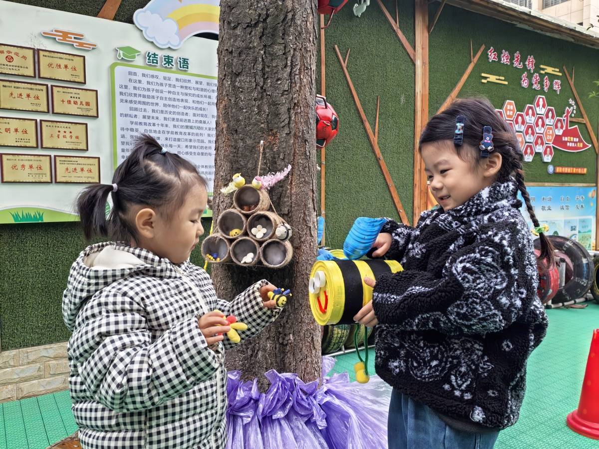 这些满是巧思的作品,都是孩子和老师共同完成的。废旧的易拉罐、纸筒、毛线在孩子们的小手中焕发新活力,让大树成为了生态校园里的生动课堂,更让孩子们在动手创作中感受春日生机,真切体会变废为宝的乐趣。