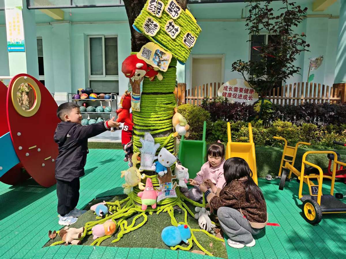活动中,孩子们化身小小设计师,在老师的引导下,用各类废旧材料动手创作、装点树木。足球变身呆萌小瓢虫,毛线缠绕出灵动小蜜蜂,纸筒拼搭成别致小鸟屋,憨态可掬的小熊玩偶挂在枝头,仿佛在和孩子们热情打招呼。另一棵大树则被绿色毛线温柔“包裹”,树根处散落着可爱的毛绒玩偶,宛如小动物在树下捉迷藏,画面温馨又萌趣。