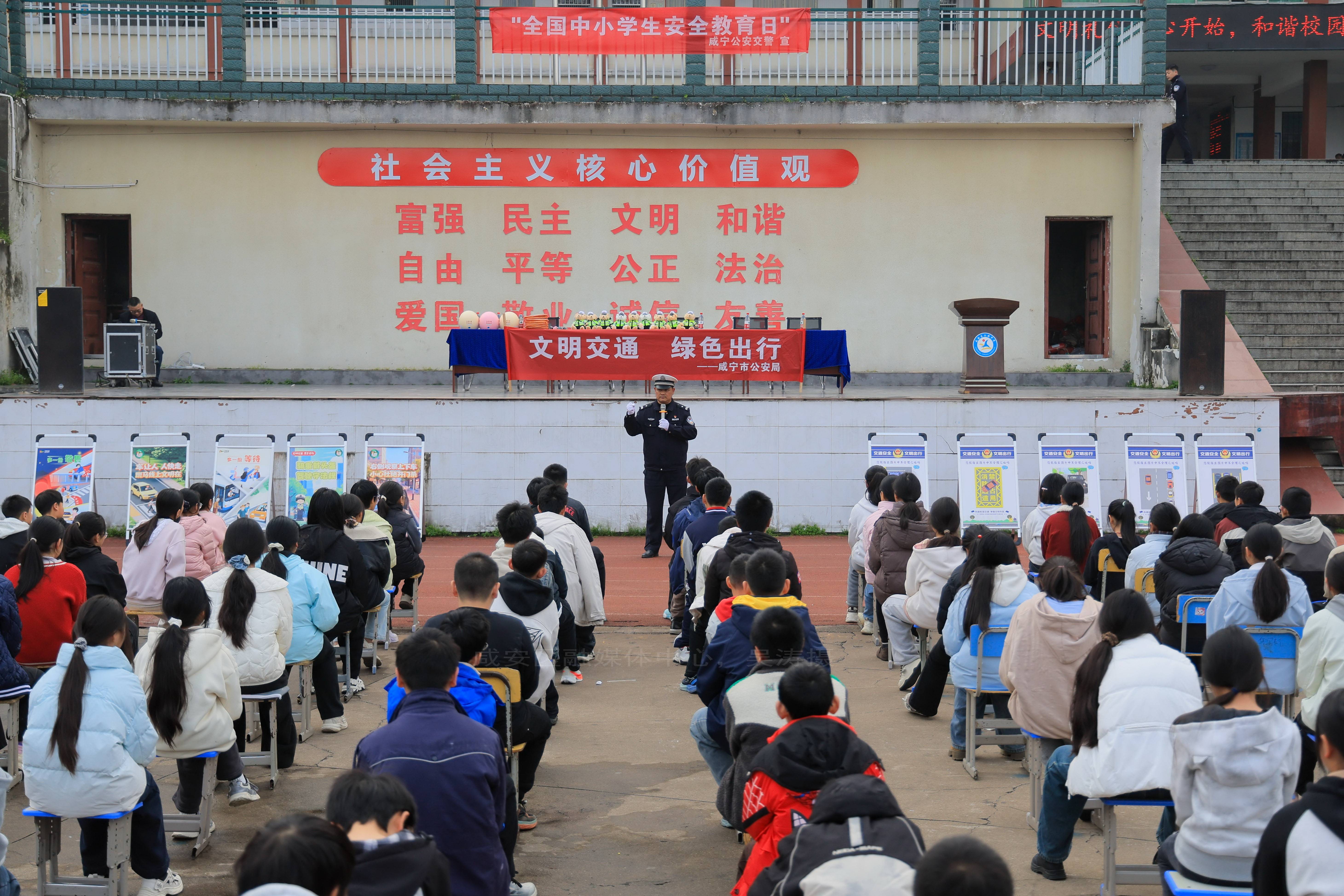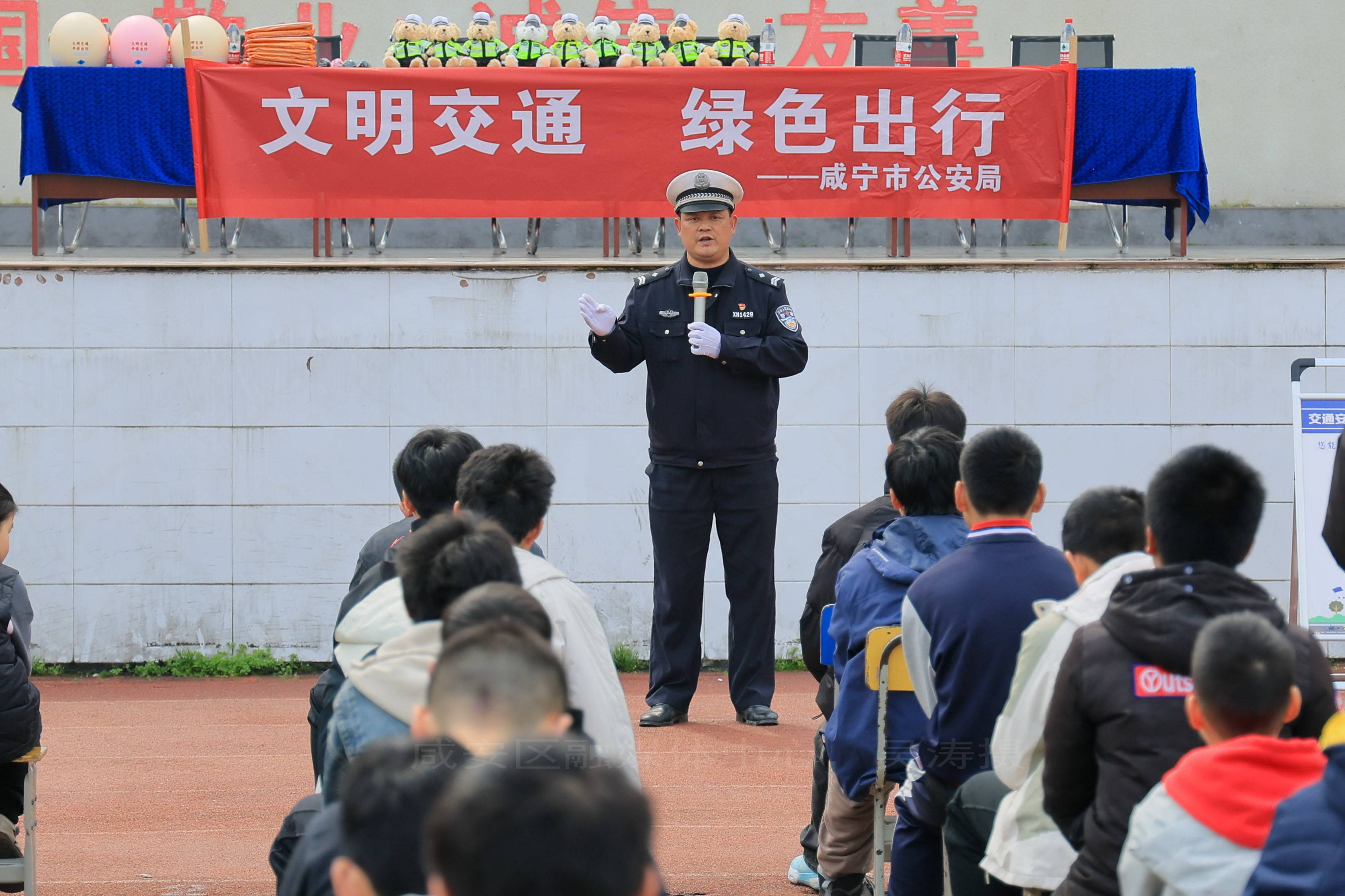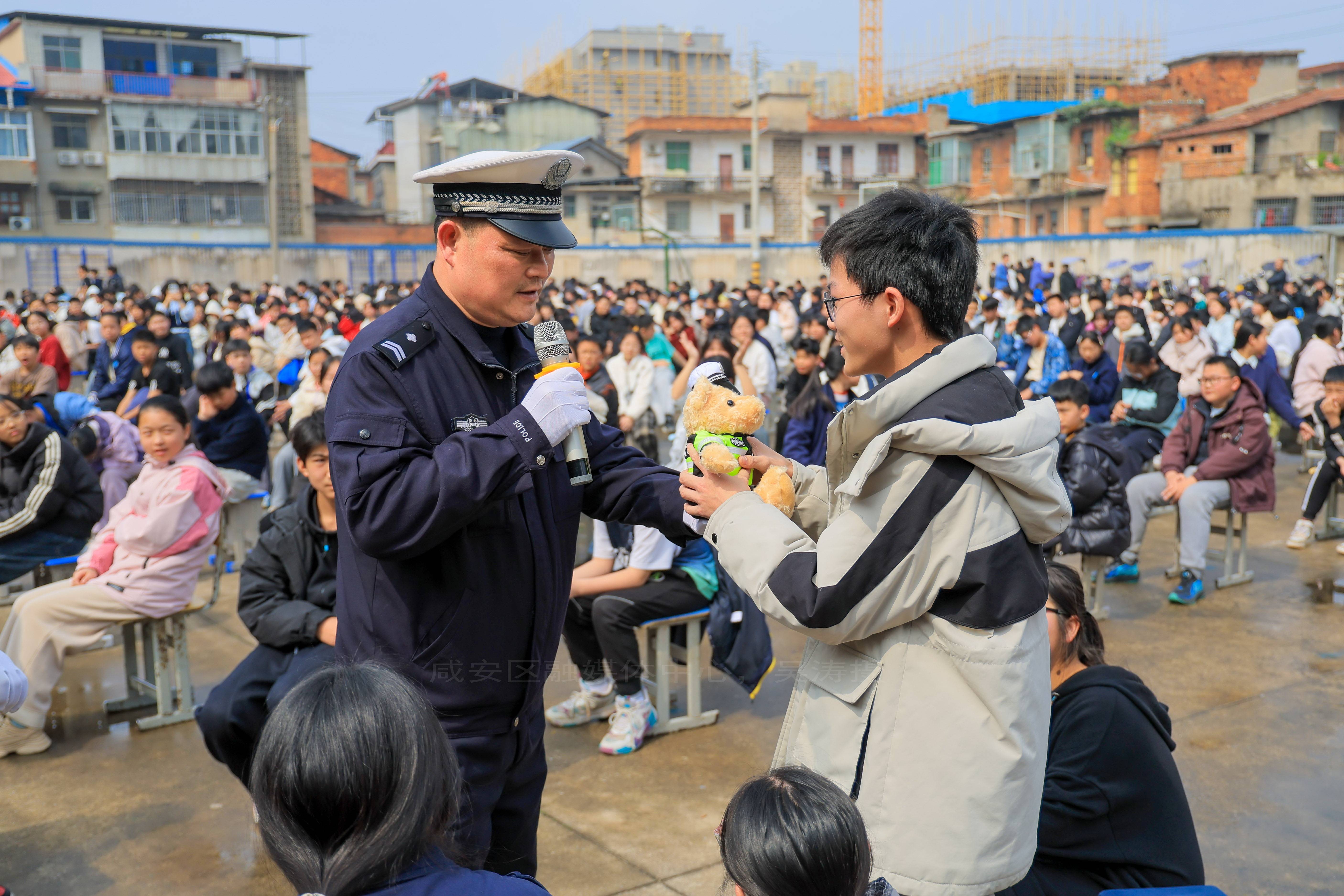 活动伊始,咸宁市公安局咸安区分局交管大队宣讲员饶继虎为大家带来30分钟交通安全宣传讲座。讲座围绕步行安全、骑行安全、乘车安全、校园周边出行风险、汽车视觉盲区、“一盔一带”等与初中生日常出行密切相关的内容展开,通过实用授课切实增强学生交通安全防护意识与应急避险能力。讲座中还设置了交通安全、绿色出行有奖问答环节,现场发放交警小熊玩偶,学生们积极参与,气氛热烈。