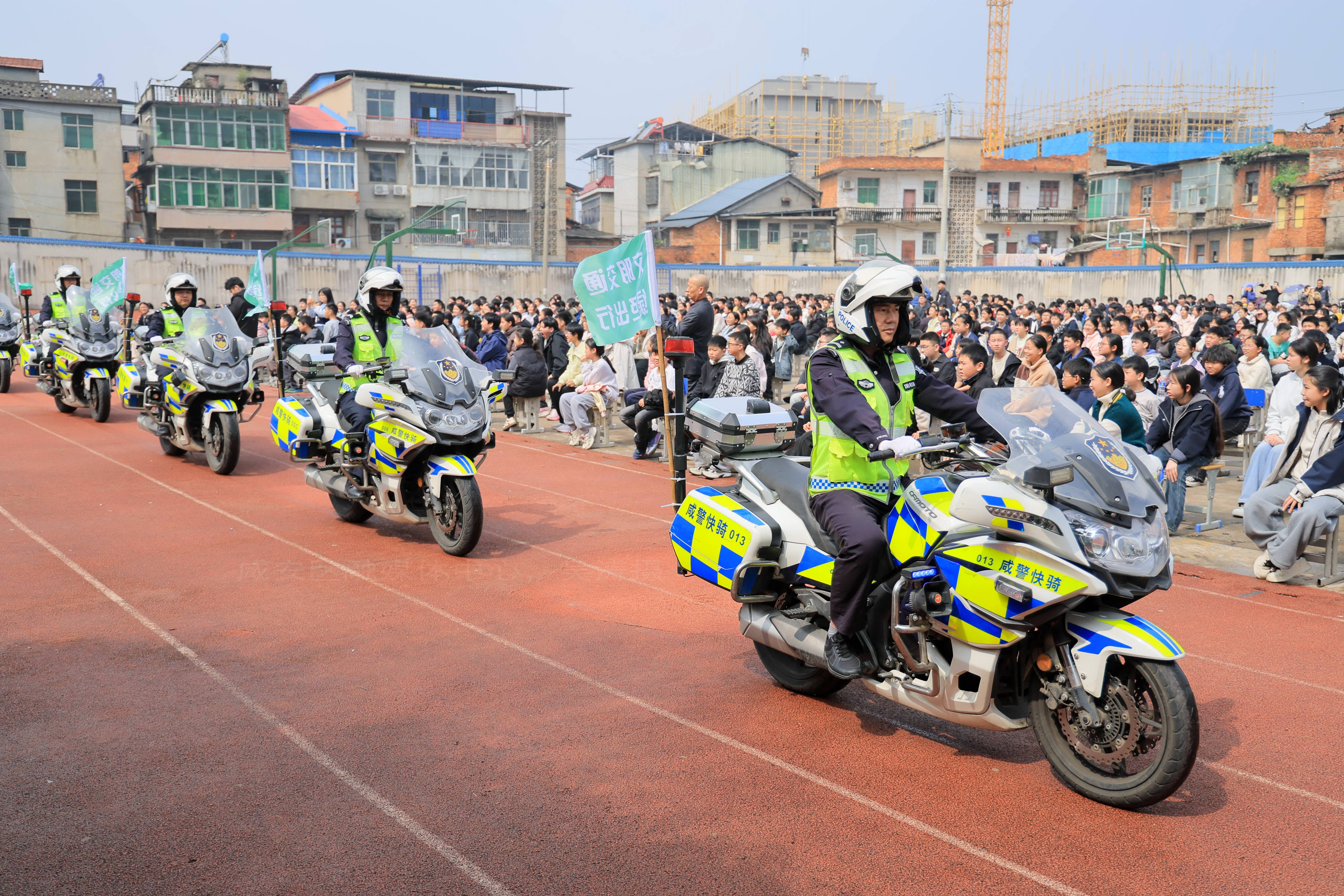 随后,活动进入绿色出行倡议宣讲环节。宣讲员宣读了《文明交通绿色出行倡议书》,倡导学生自觉文明通行、规范停放,践行绿色低碳理念。与此同时,骑警们驾驶铁骑,携带绿色出行旗帜沿操场巡游展示,成为校园里一道亮丽的风景线。