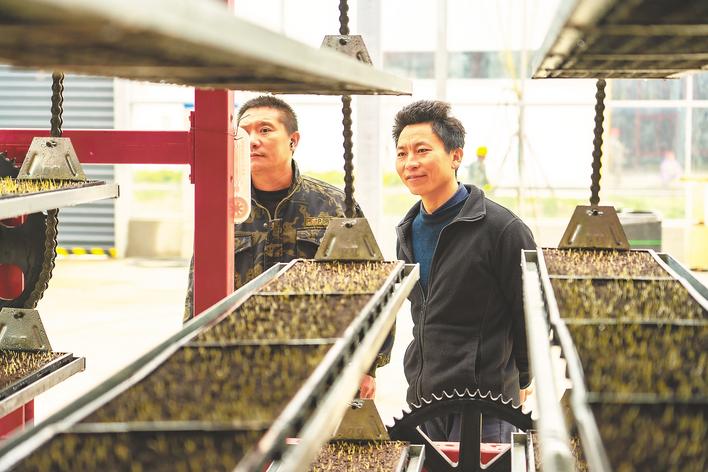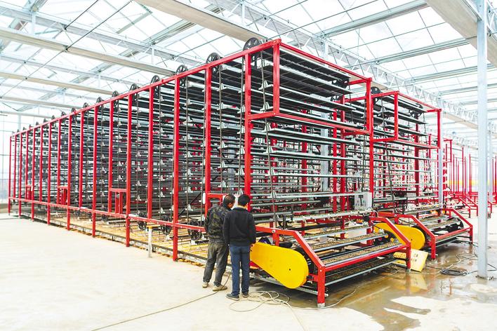 农事服务中心引进了先进的循环运动式育苗设备,采用W型空间结构及传动系统,实现多层吊篮循环移动,有效保障作物生长过程中温度、湿度、光照和空气流通的均匀性,提升育苗质量与效率。设备不仅用于水稻育秧,还推行“农时育秧+闲时育苗”弹性利用模式。“我们3月至6月育秧,7月至来年3月育蔬菜苗,供给周边企业。”夏以良表示,平时服务社会化生产,急时统筹粮菜应急保供,实现资源“一专多能、平急结合”。