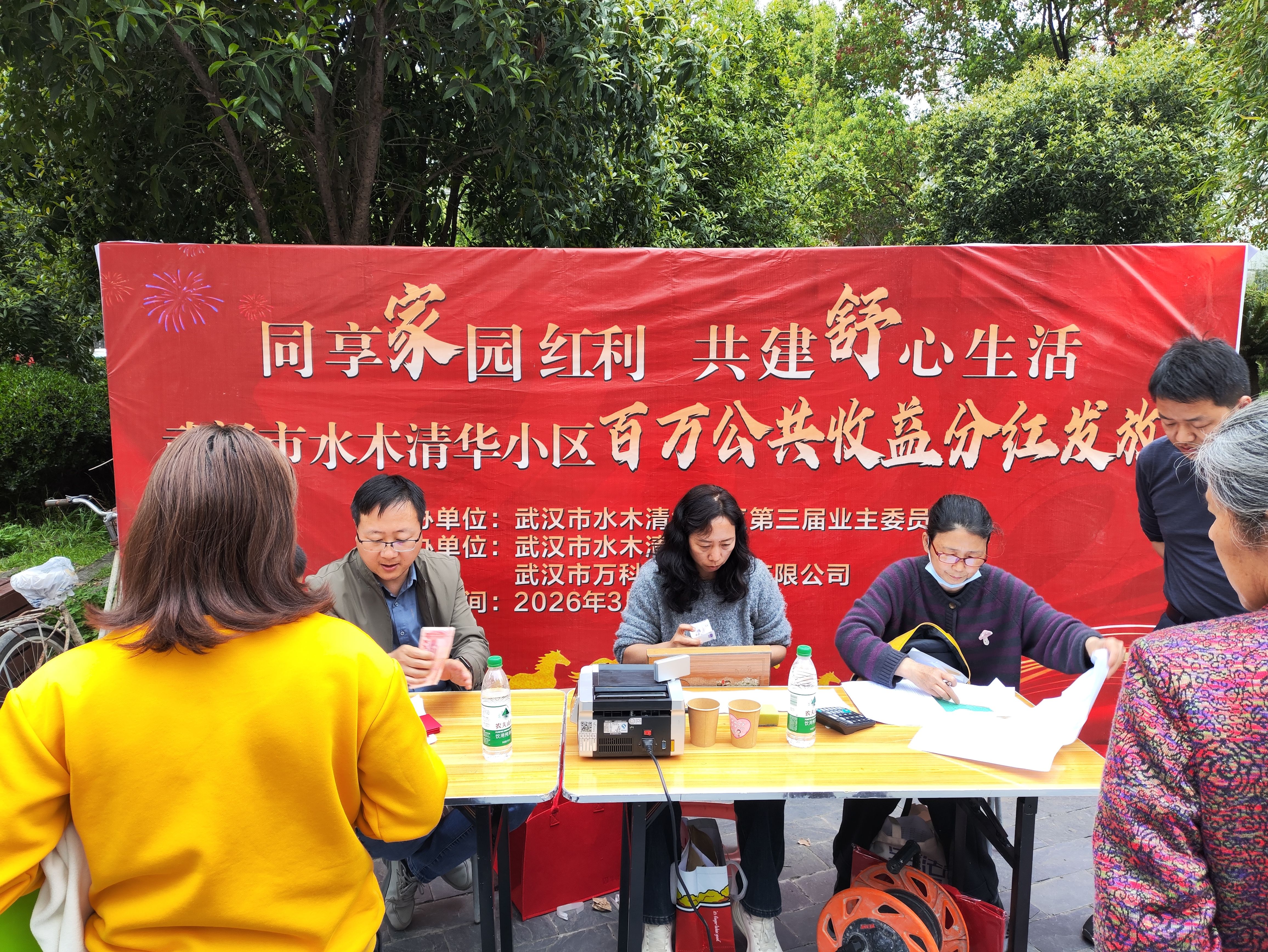 3月29日,武汉经开区水木清华小区物业服务中心门口热闹非凡。一沓沓百元现金被分别装进红包,整齐码放在桌上,业主们排着队,笑容满面地等待领钱。当天,该小区第三届业委会向全体业主发放公共收益分红,总额90.8万元。