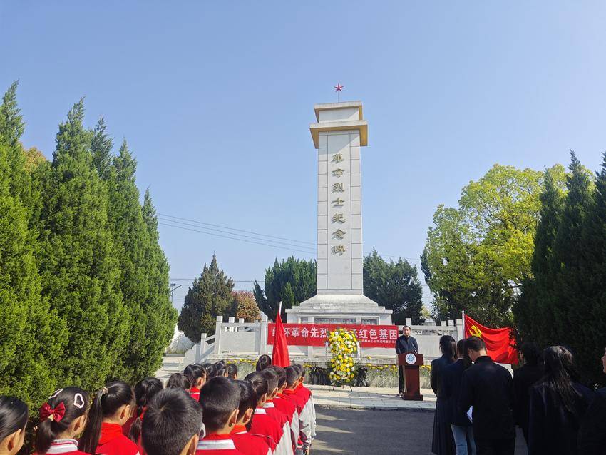 活动现场庄严肃穆,师生列队在烈士纪念碑前聆听革命事迹,代表们敬献花篮与菊花,全体人员默哀、三鞠躬,向英烈致以敬意。现场还重温入党、入队誓词,党员与学生代表相继发言,学校党支部书记胡斌作总结发言,勉励师生传承红色精神、勇担时代使命。