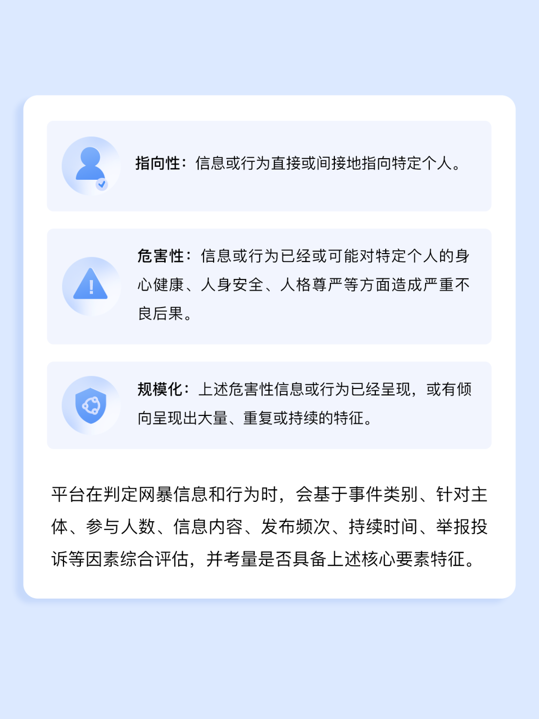 “指向性”锁定特定个体攻击,“危害性”衡量身心损害后果,“规模化”界定集中传播态势,这套框架针对网暴各个环节的核心要素,全面区分了合理舆论监督与恶意攻击,明确了平台治理网暴的判定要素与规则。