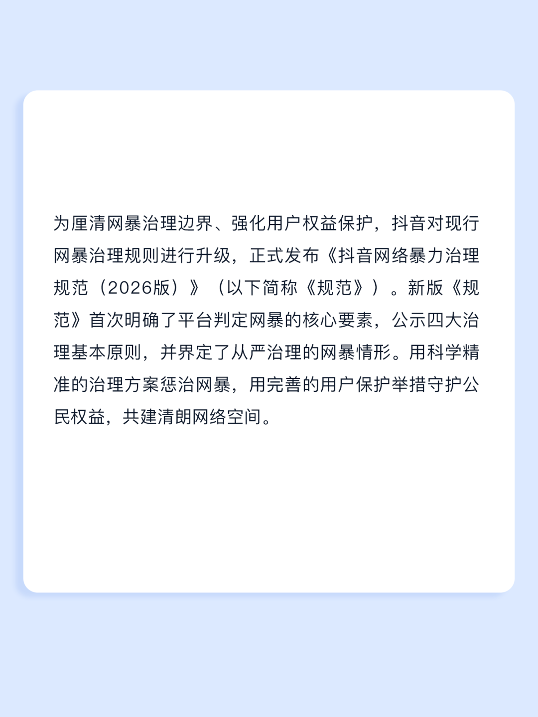 网络暴力作为互联网场域的“毒瘤”,曾多次酿成他人“社会性死亡”等悲剧,其治理始终是社会关注的焦点。近日,抖音发布2026版《抖音网络暴力治理规范》,明确“指向性、危害性、规模化”三大网暴判定核心要素,披露“避免伤害”“特别保护”等四大治理原则,试图为网暴治理提供更清晰的平台规则指引,既让自身治理更具透明度,也为行业提供了可复制的治理范本,彰显了协同共治的务实态度。