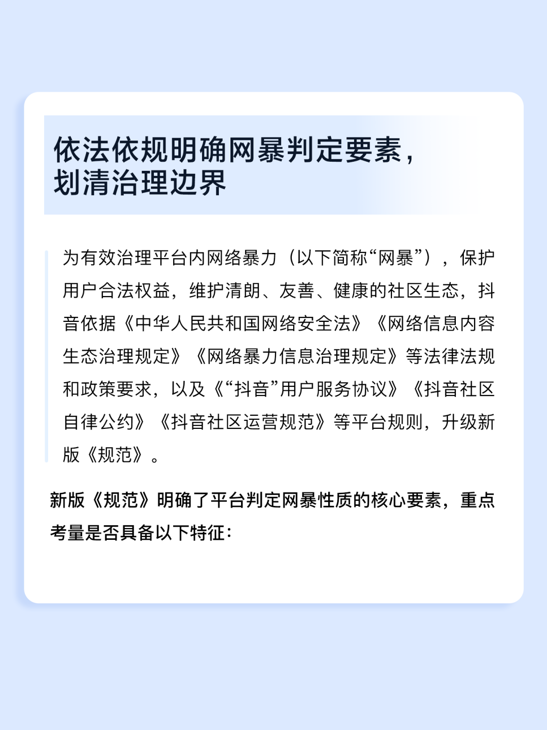 对此,抖音平台在具体处理相关内容时,不会仅凭某一句话或某一条内容下结论,而是结合事实、证据和当时的语境,对每一个个案进行综合判断。通过将“指向性攻击意图”“实质性伤害”“规模化扩散”等关键特征公开列明,既呈现了平台的基本判断逻辑,又保留了在不同场景下结合具体证据进行个案认定的空间,形成“要素判定+场景事实判断”的治理依据。