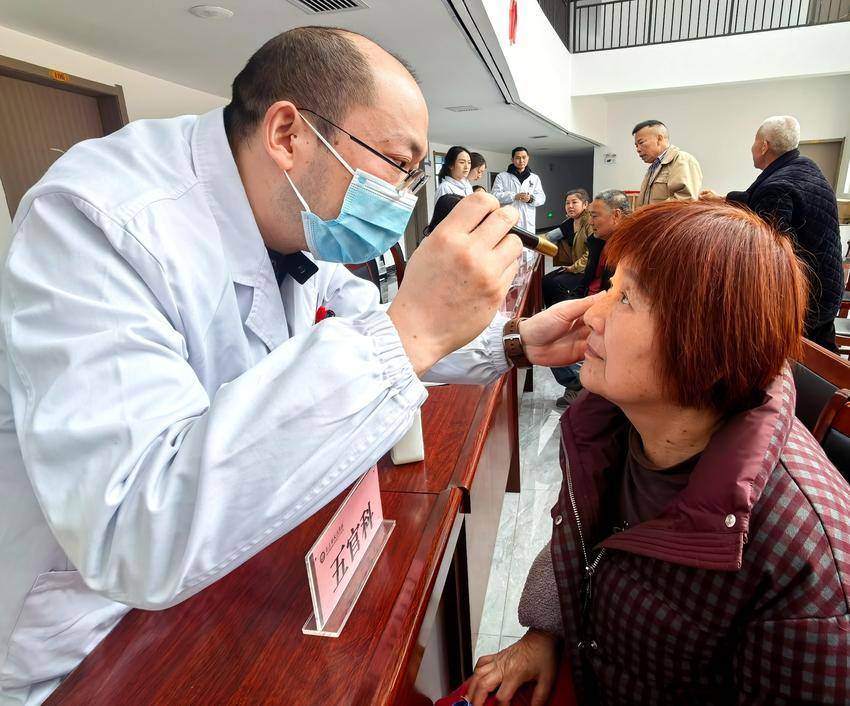 义诊现场,医护人员麻利地摆好视力表、手持式眼底照相机、便携式裂隙灯等设备,仿佛把医院眼科门诊的“精华版”整个搬了过来。一位护士半蹲着身子,为一位听力不太好的大爷举着视力指示棒,一遍遍比画,直到老人准确说出方向;江孝鑫医生盯着裂隙灯里的影像,神情专注得像在破译一封关乎光明的密码信,不一会儿,他轻轻拍了拍一位婆婆的手背:“婆婆,您右眼白内障已经成熟了,可以手术了。您放心,现在这是微创手术,十来分钟就好,医保报销下来,自己花不了多少钱。”说着,他翻开随身带的医保政策宣传册,一条条指给老人看,连术后多久能拆纱布、什么时候能看电视,都说得细细致致。