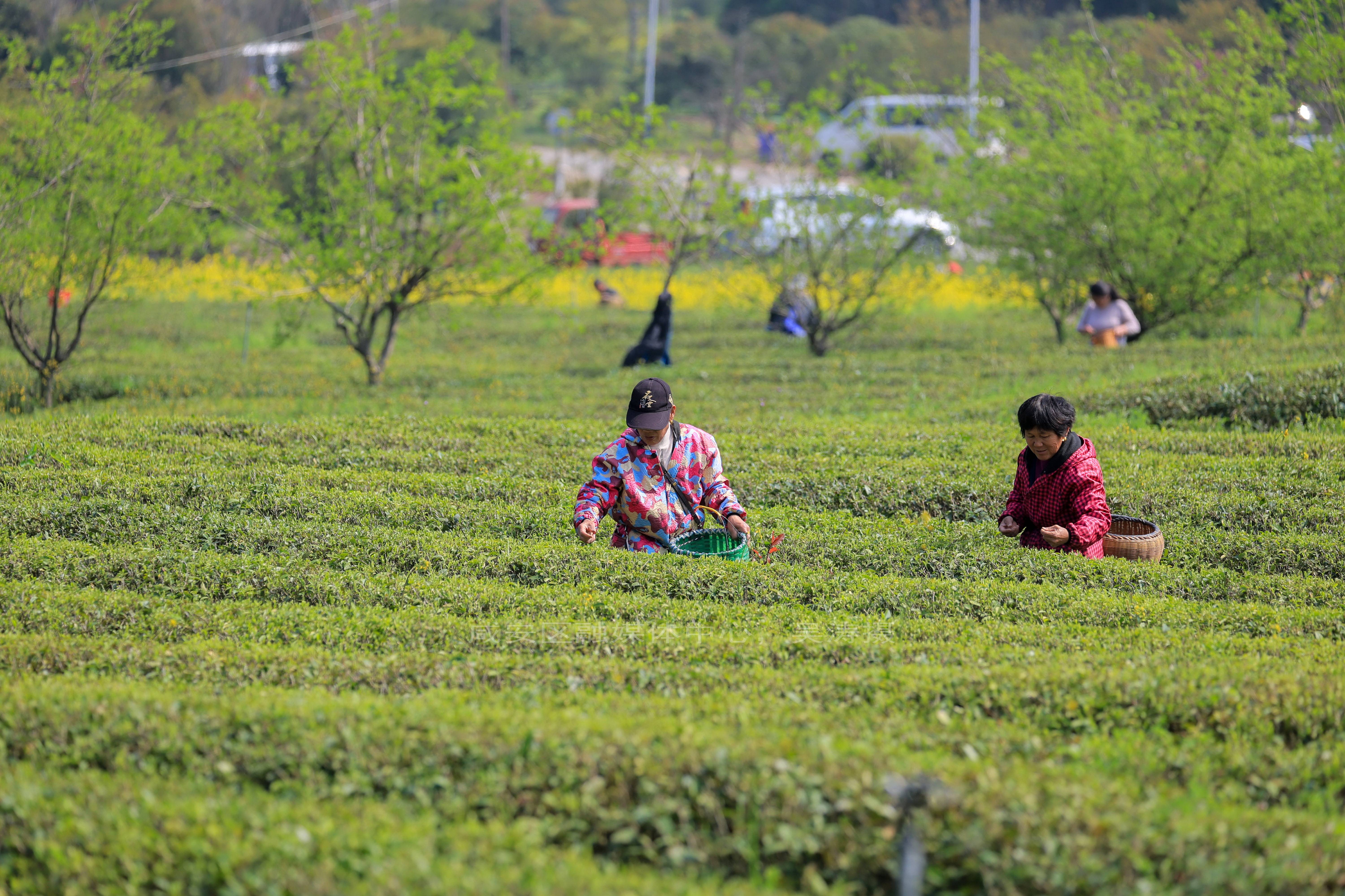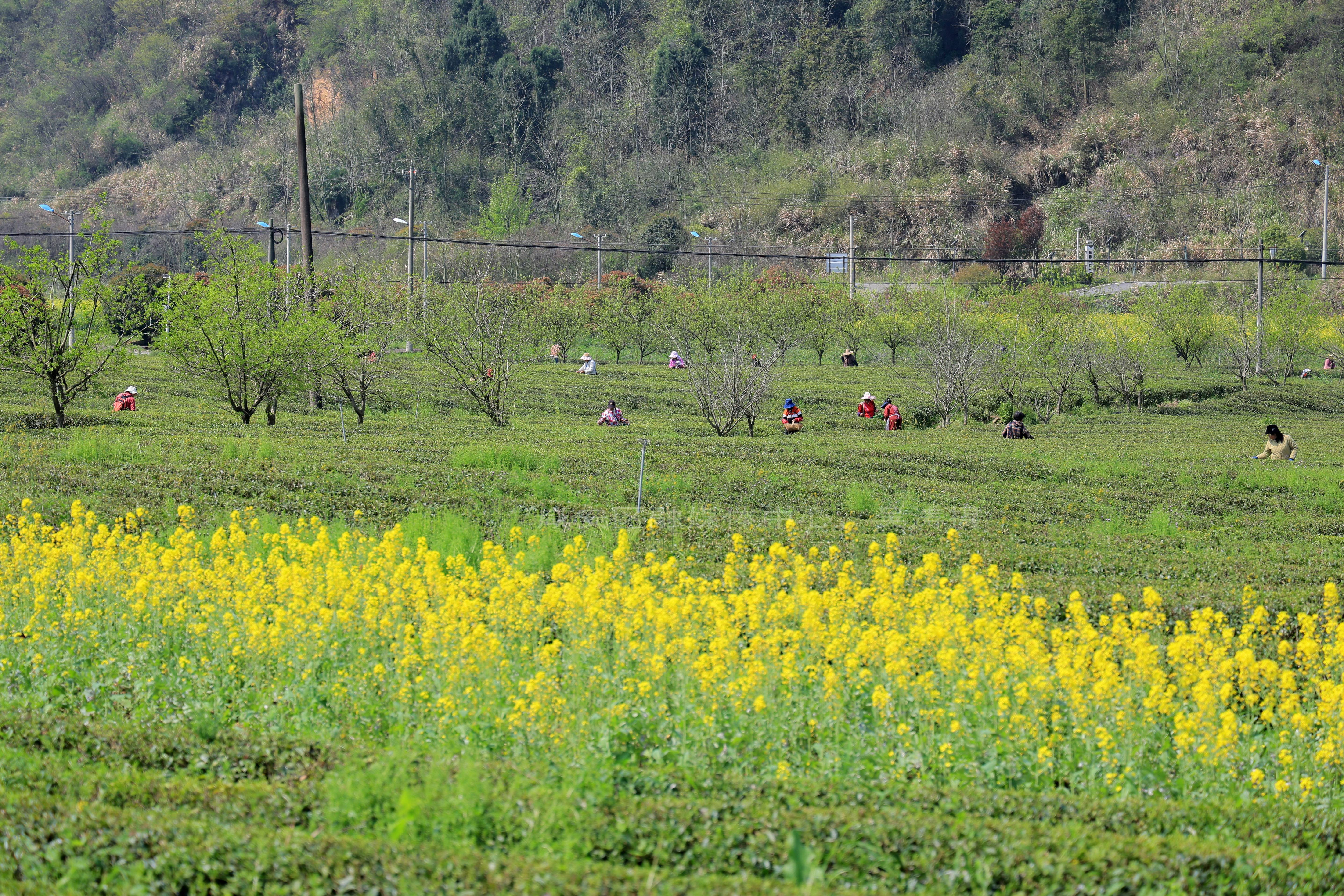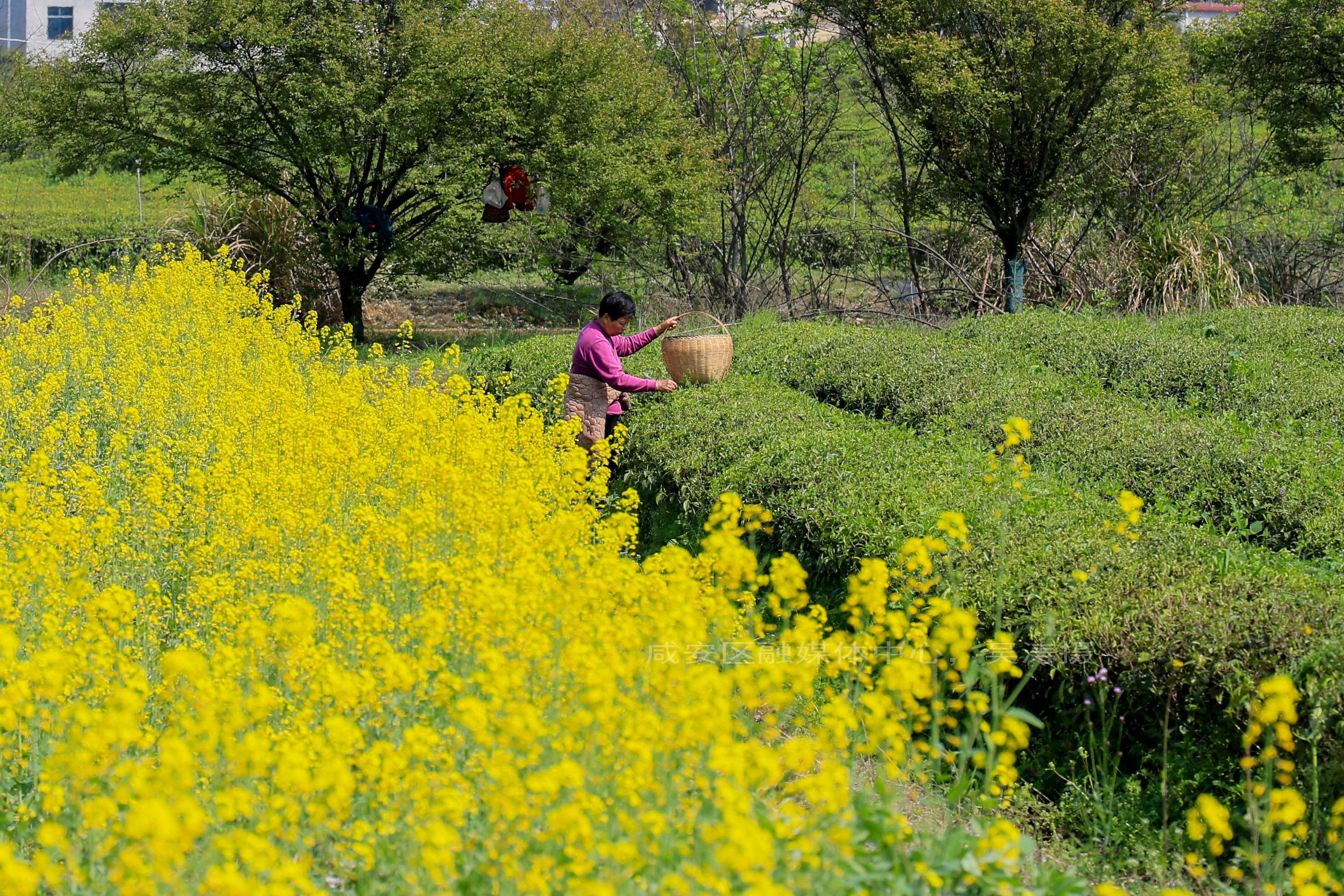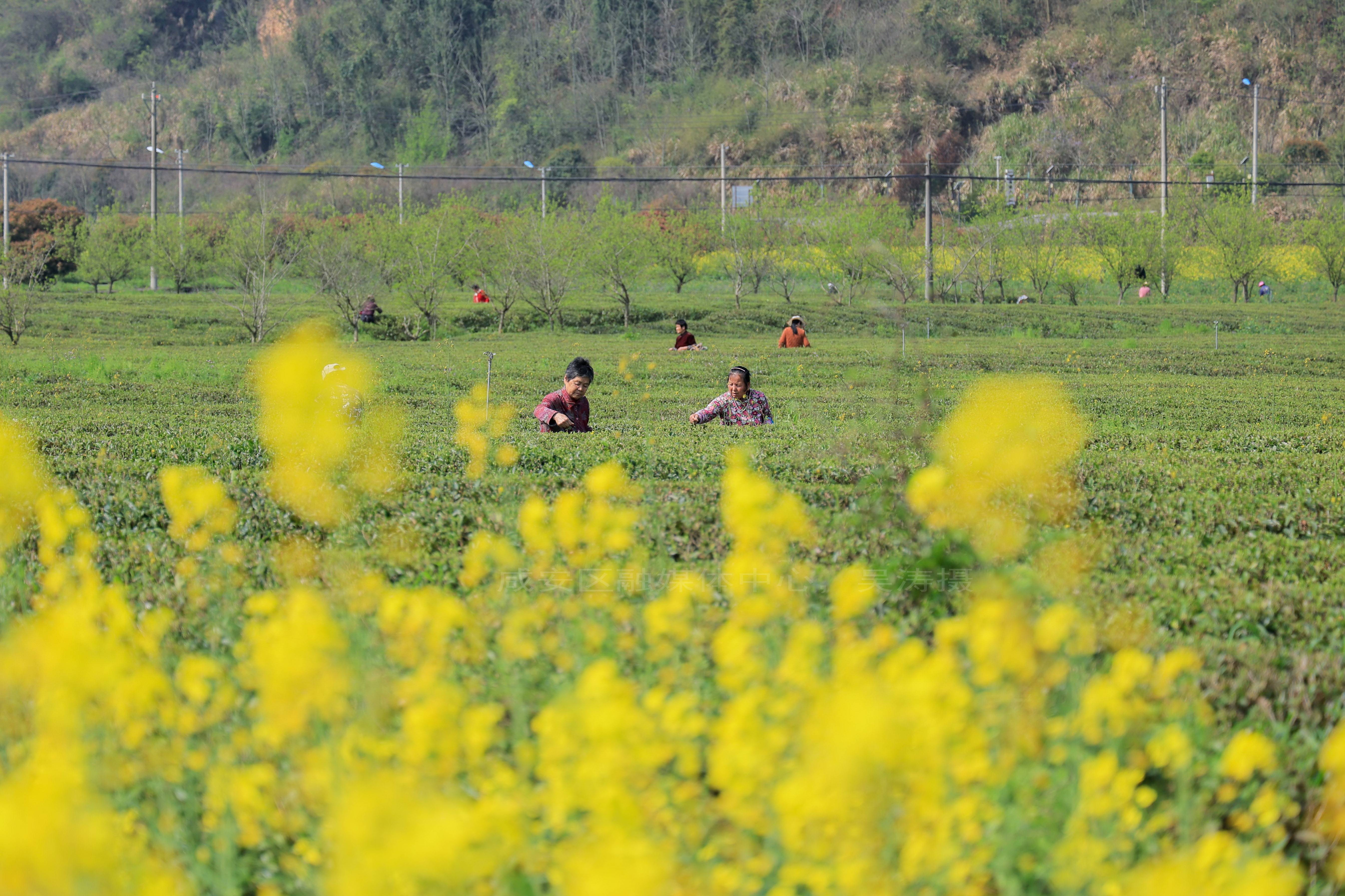 湖北日报客户端讯(通讯员吴涛 王迪 陈初安)4月1日,咸安区大幕乡西山下茶叶基地迎来春茶采摘季。漫山茶园绿意盎然,茶农们穿梭在茶垄间,指尖翻飞采撷鲜嫩茶芽,金黄油菜花与翠绿茶海相映成趣,勾勒出一幅春日丰收的乡村画卷。