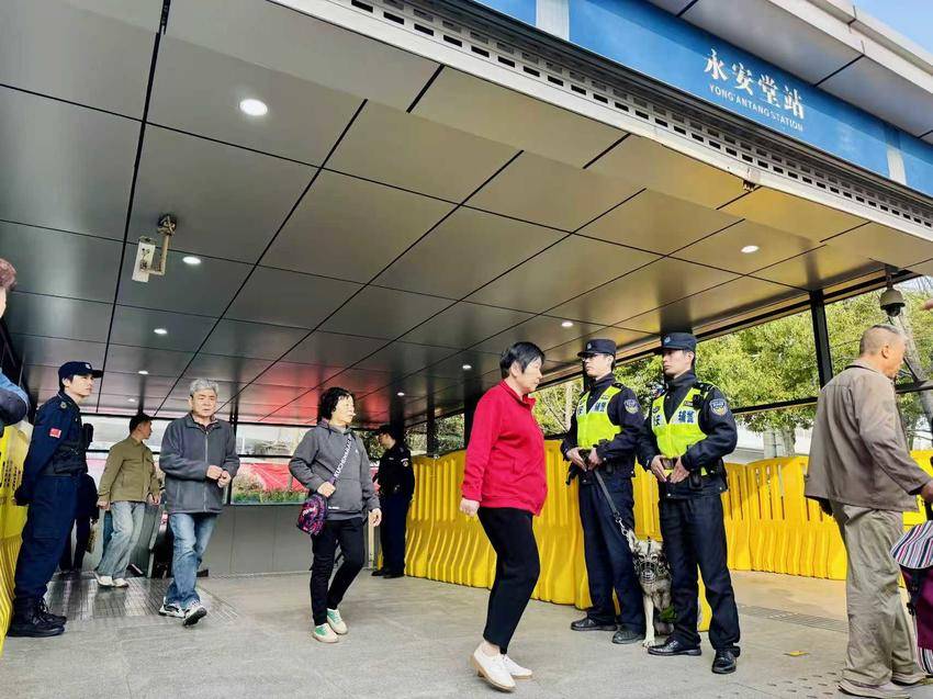4月3日15时许,在永安堂地铁站,站厅、出口通道均已设置蓝底白字的指引标志。伴随着一趟趟列车到站,地铁站迎来一波客流小高峰。警灯闪烁之处,民警魏丽莎正带队在站内巡逻。