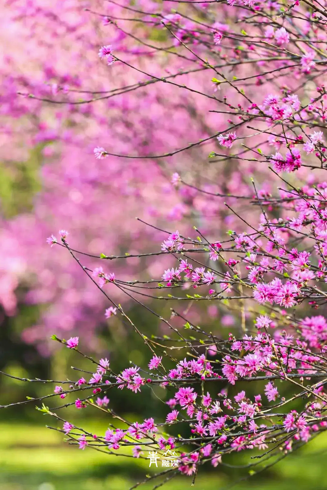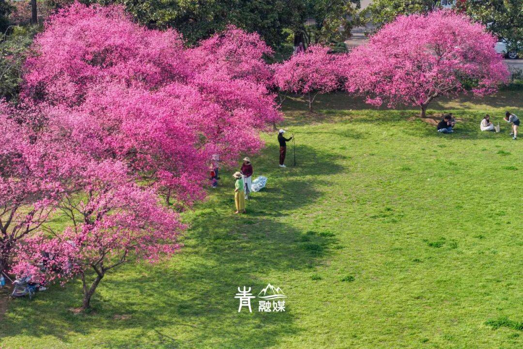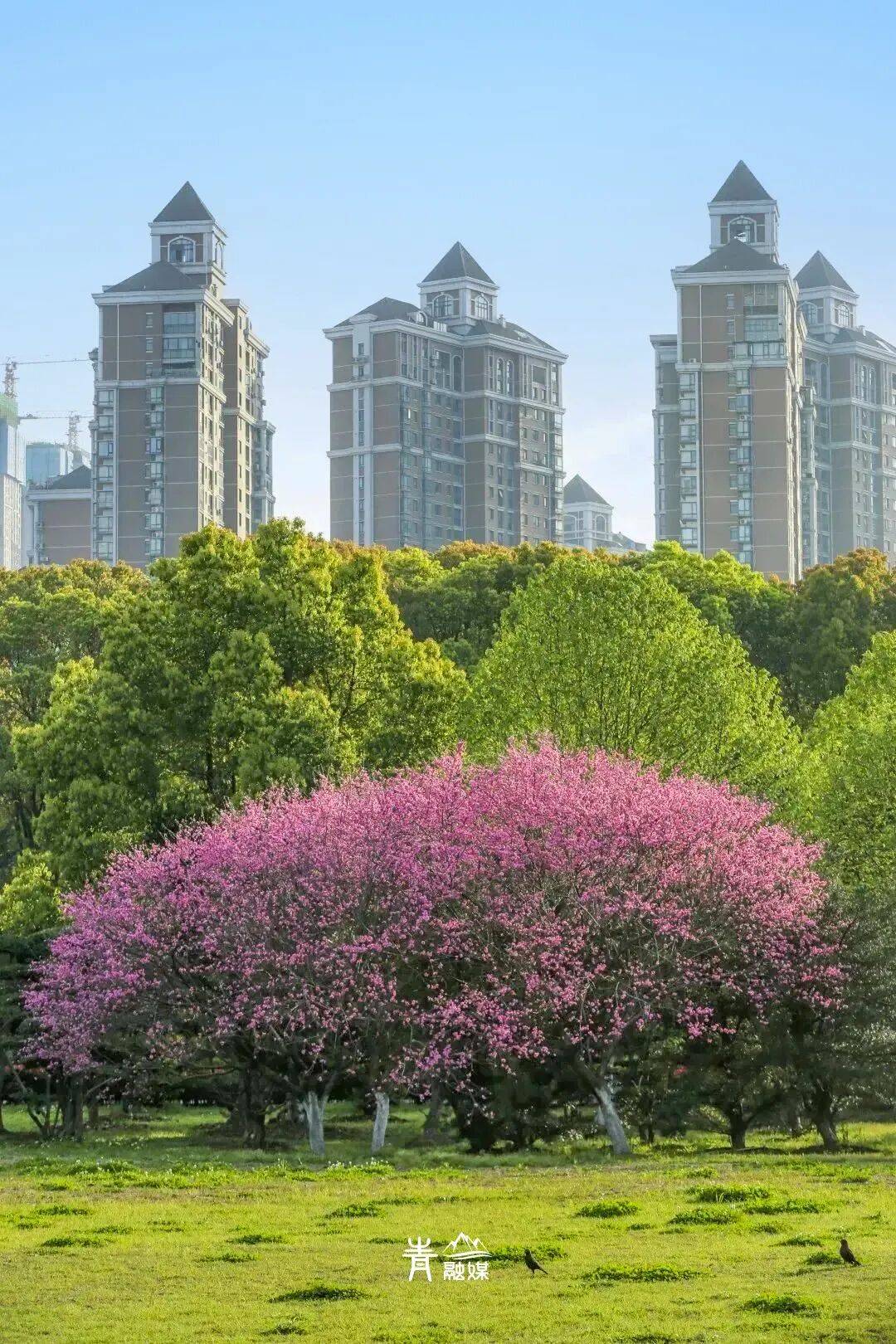 绯红菊桃配嫩绿草坪,衬着远处楼宇,目之所及皆是治愈,随手一拍都是无滤镜春日大片。