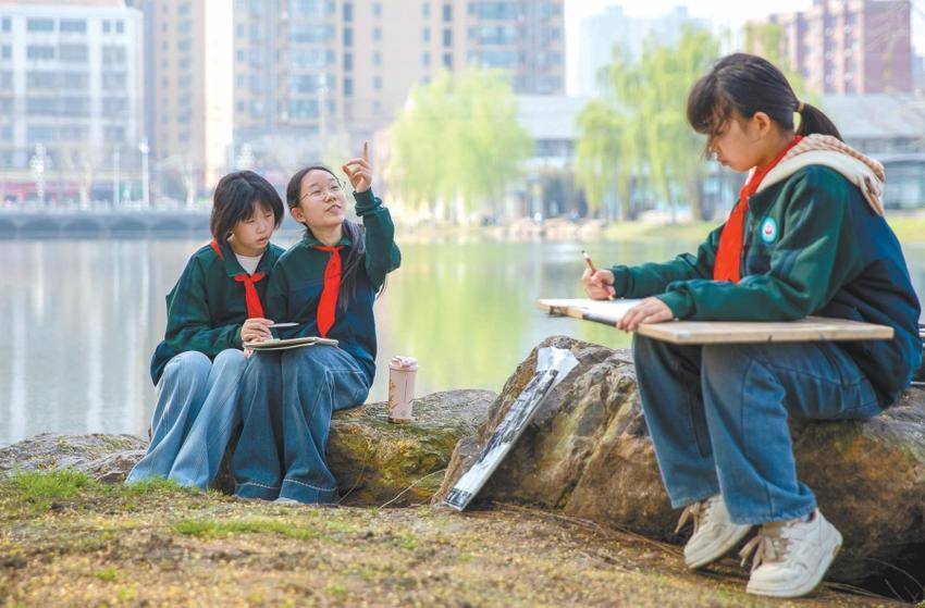 湖北日报客户端讯(通讯员陈亚东)春暖花开,我市各学校纷纷组织学生来到户外,用画笔描绘春天美景。图为市弘文学校学子在流潭公园写生。