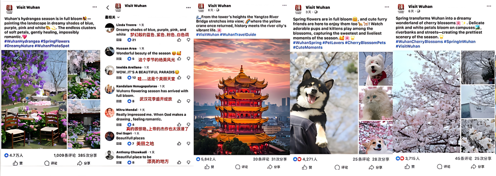 账号的出圈,并非“美图+美景”的单向输出,而是通过科技赋能、情感连接、文化共鸣等方式,打造出一系列“可参与、可互动、可分享”的文旅内容产品。运营人员将武汉春日花景制成“春日赏花日历”,包括沙湖公园郁金香、消泗油菜花海、云雾山杜鹃、汉阳公园牡丹等,向全球网友发出邀约。近年来推出“AI赏花”“云赏樱”视频直播互动、武汉英文打卡指南等内容产品,多次创造百万级曝光量的传播案例。
