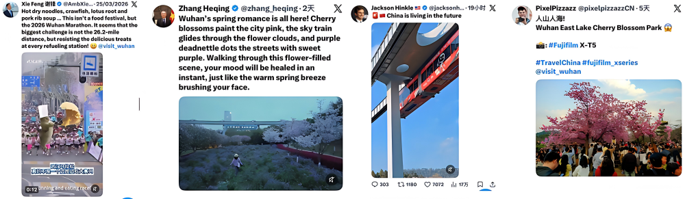 在评论区和转发区,多位外交官与海外博主的身影也频频“现身”。中国驻美国大使谢锋在推特转发了武汉马拉松视频并与官方账号互动;中国驻巴基斯坦使馆参赞张和清转发了武汉春日空轨视频;法国驻武汉总领事馆官方账号转发了武汉街头机器人视频。拥有300万粉丝的美国博主Jackson Hinkle发布武汉空轨视频并表示:“中国正走进未来。”英国摄影师兼记者@PixelPizzazz连续多日与账号互动,主动推介东湖樱花。