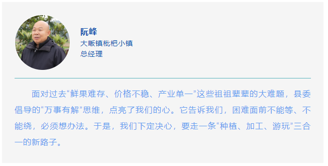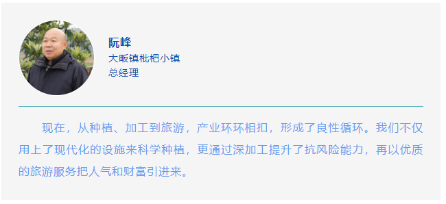三件事环环相扣,从田间到车间再到山间,一条产业链串起了种植、加工、旅游三个环节,也串起了乡亲们的增收路。如今,枇杷小镇已不再是单一果园,而是一个“三产”融合的活力之地。